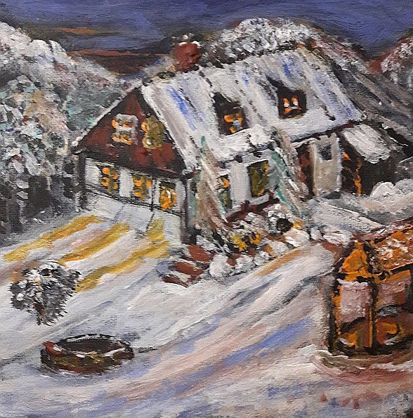 Mały śliczny, sentymentalny obrazek przedstawiający domek w górach w scenerii zimowej.