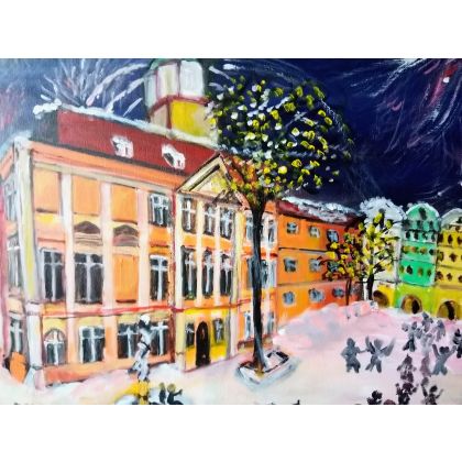 Powierzchnia obrazu powleczona impregnatem satynowym z połyskiem.