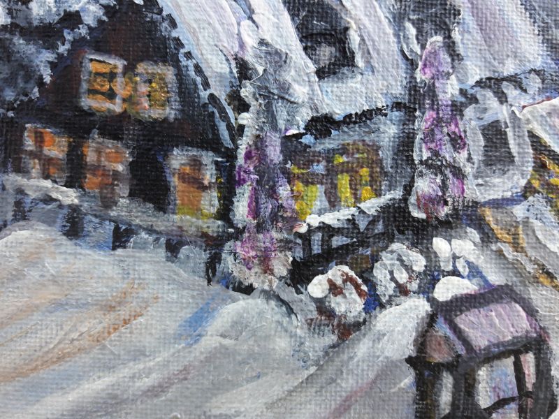 Powierzchnia obrazu powleczona impregnatem satynowym z lekkim połyskiem.