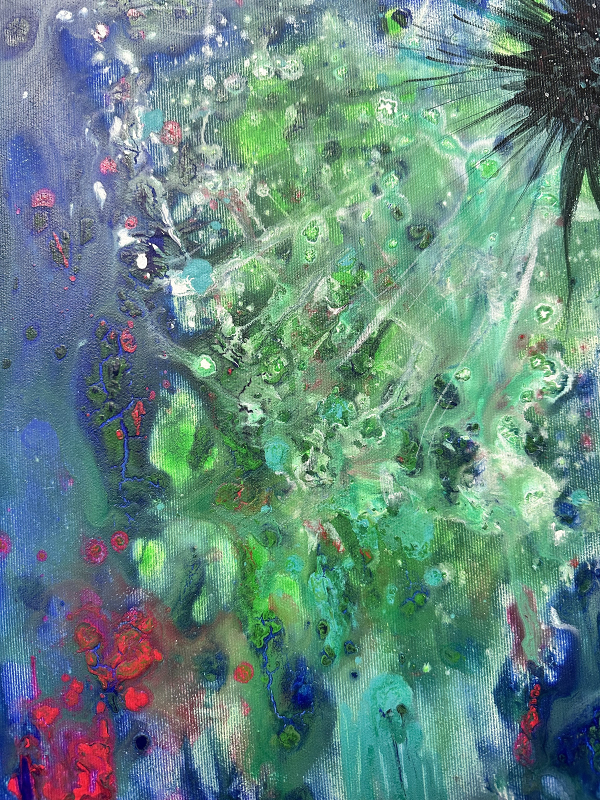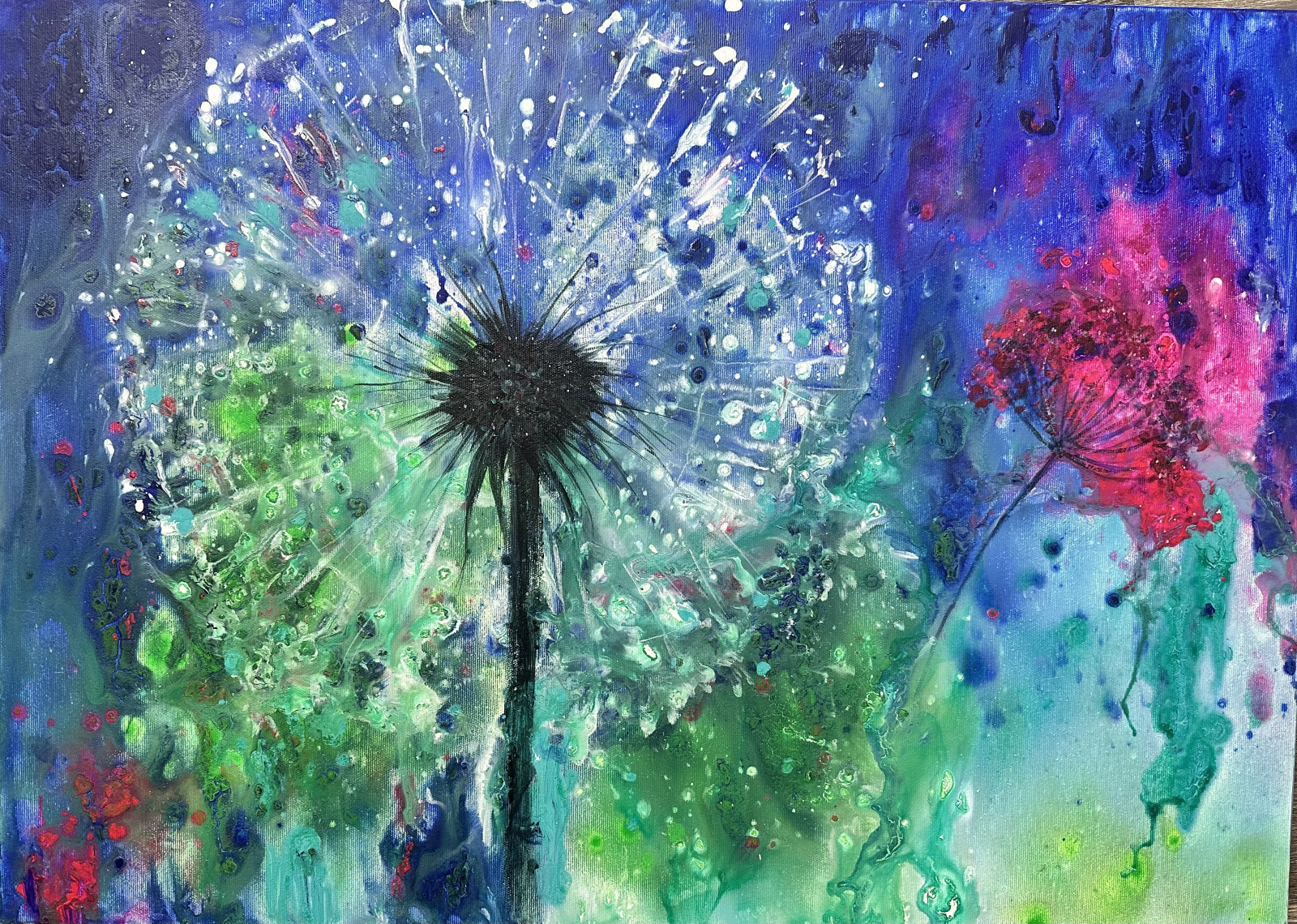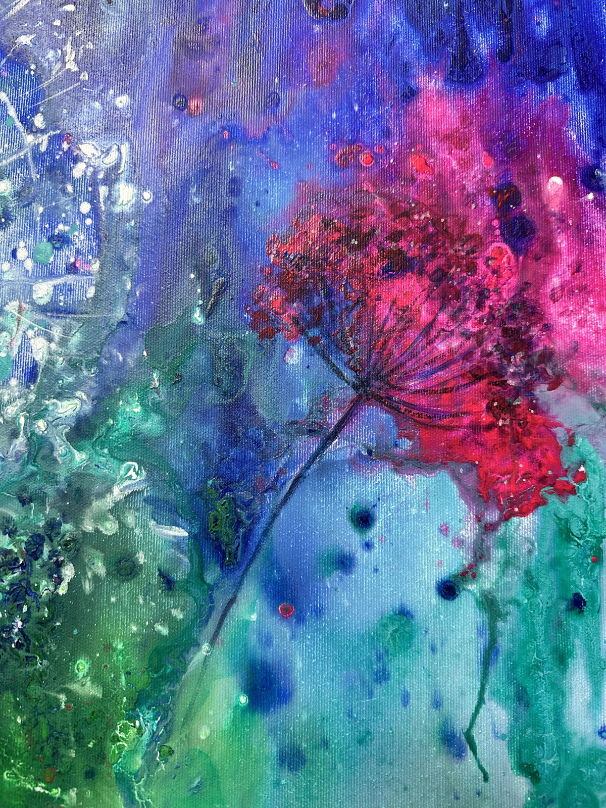 Obraz akrylowy na podobraziu o wymiarach 70x50 cm. Boki zamalowane w kolorach obrazu, zamontowana zawieszka, gotowy do powieszenia.