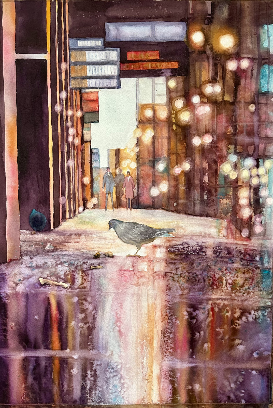 Duża akwarela namalowana na profesjonalnym papierze amerykańskimi akwarelami firmy Daniel Smith. W białym passepartout o wymiarze zewnętrznym 50x70 cm, pasuje do każdej standardowej ramy 50x70 cm.