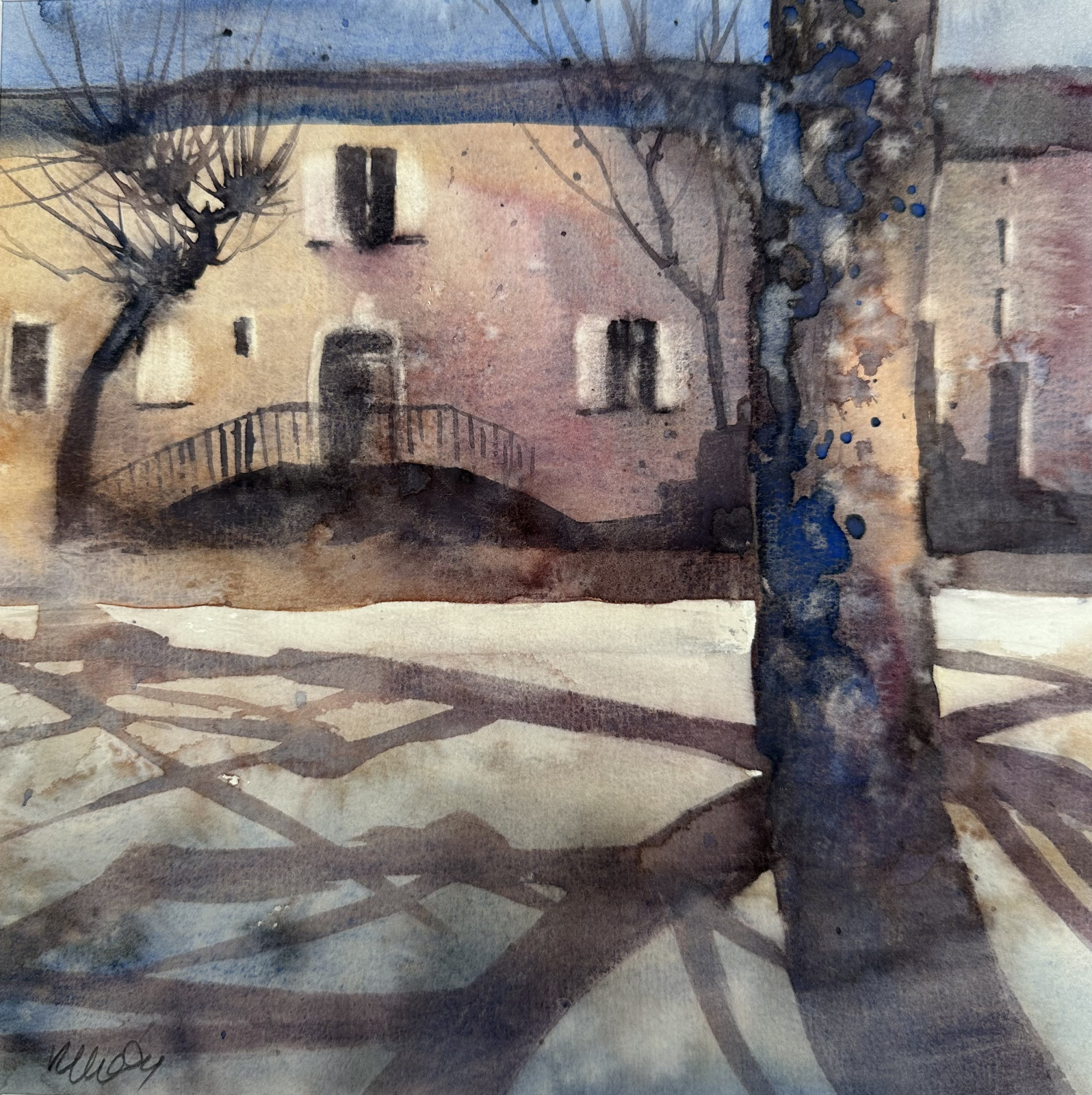 Obraz akwarelowy namalowany na profesjonalnym papierze amerykańskimi akwarelami firmy Daniel Smith. Nowoczesny kwadratowy format. Oprawiony w białe passepartout o wymiarach zewnętrznych 25x25 cm, okienko na obraz 20x20 cm. Pasuje do każdej standardowej ramy 25x25 cm.