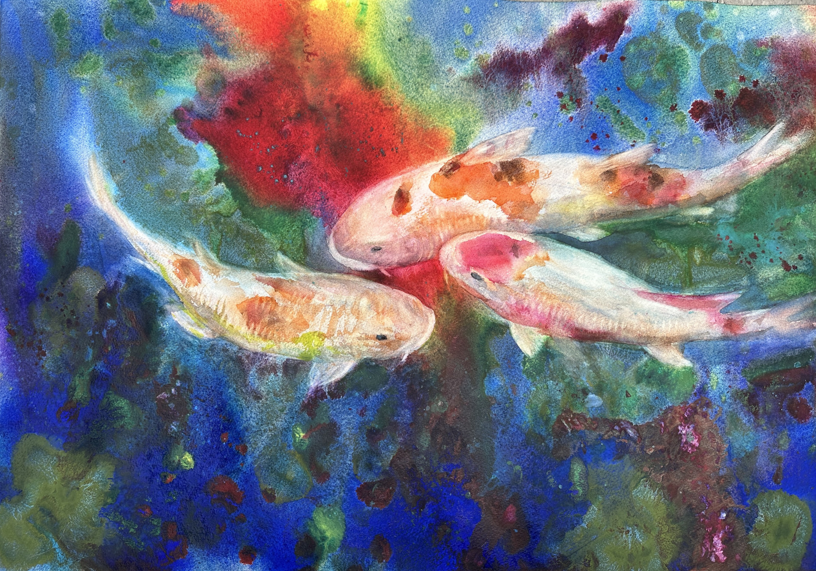 Intensywna, duża akwarela namalowana na profesjonalnym papierze farbami amerykańskiej firmy Daniel Smith. Oprawiona w białe passepartout o wymiarze zewnętrznym 50x70 cm. Pasuje do każdej standardowej ramy 50x70 cm.