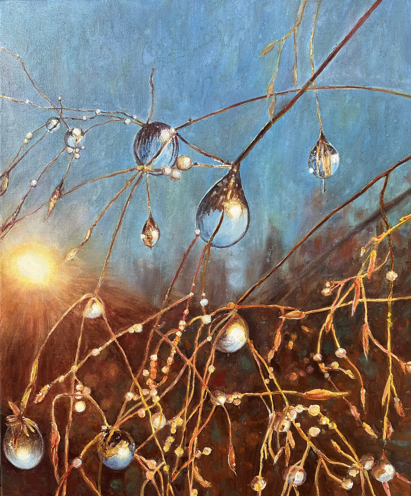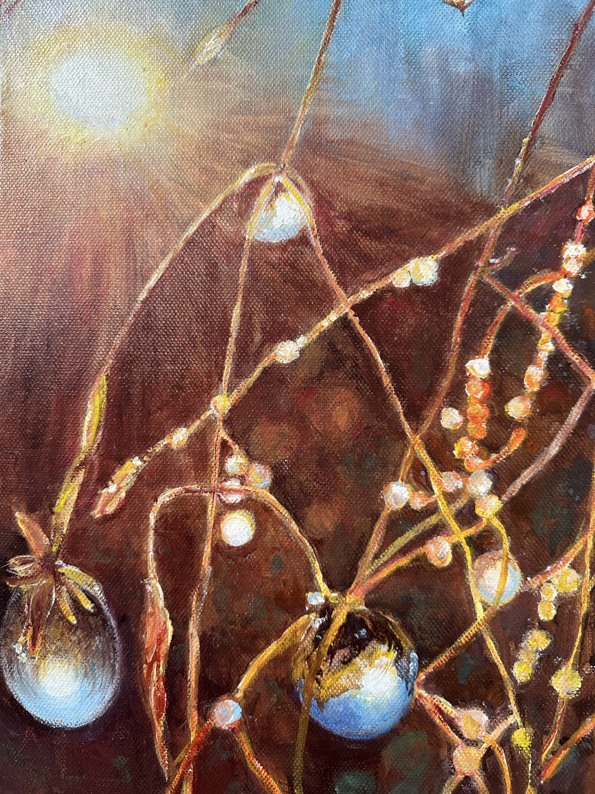 Obraz olejny na podobraziu o wymiarach 50x60x1,6 cm. Boki zamalowane w kolorach obrazu, zawerniksowany, zamontowana zawieszka, gotowy do powieszenia.