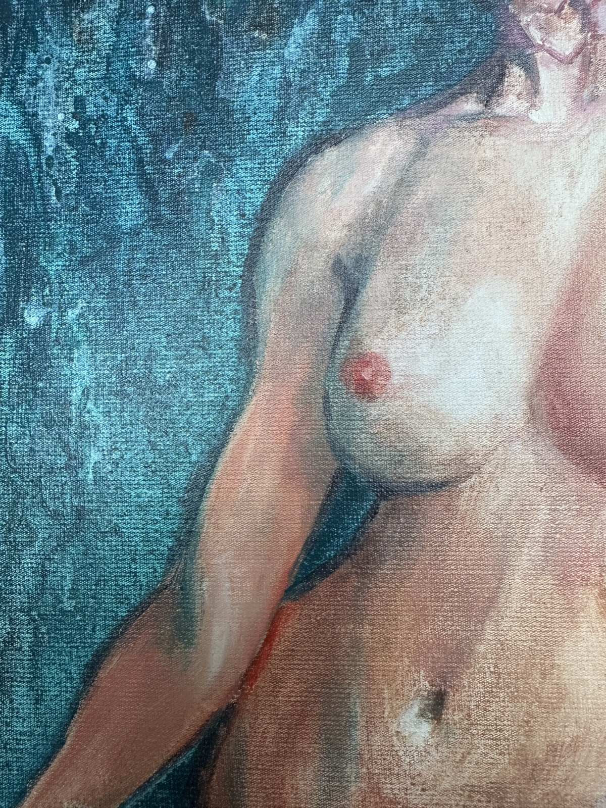 Subtelny kobiecy akt malowany farbami olejnymi na grubym podobraziu o wymiarach 30x30x2,3 cm.