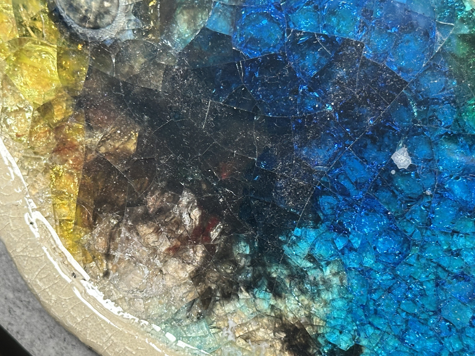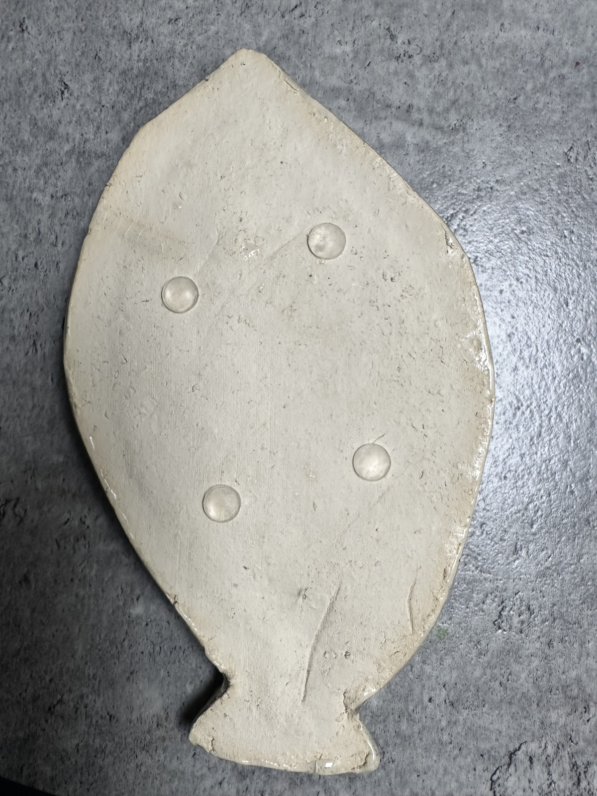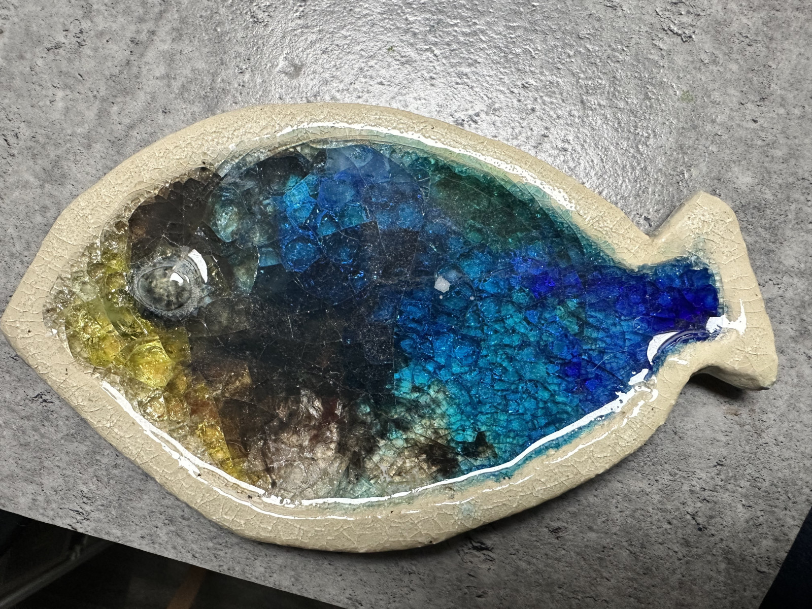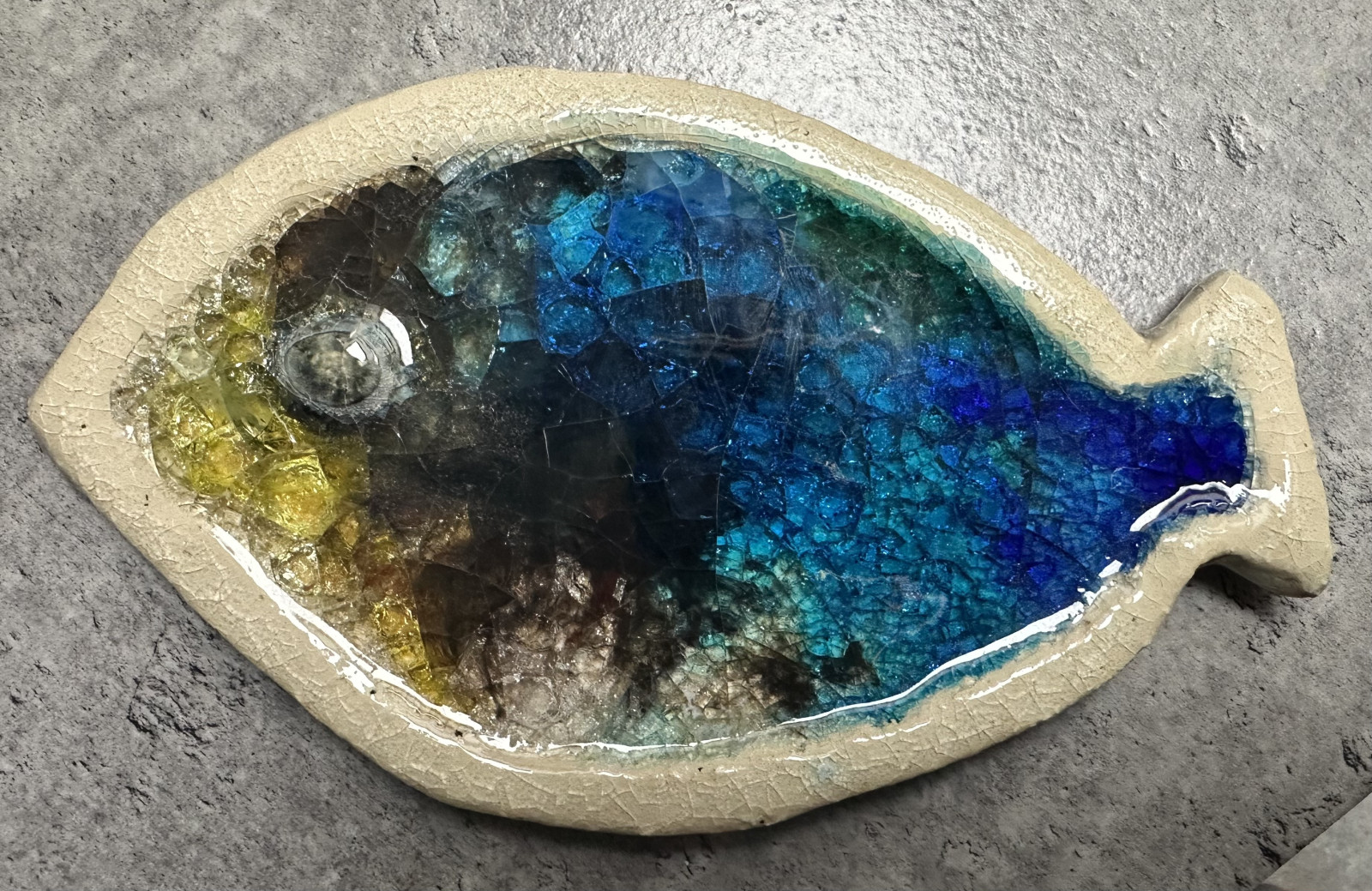 Ceramiczna rybka z zatopionym kolorowym szkłem, szkliwiona, robiona i wypalana w profesjonalnej pracowni ceramicznej. Od spodu ma przyklejone silikonowe nóżki.