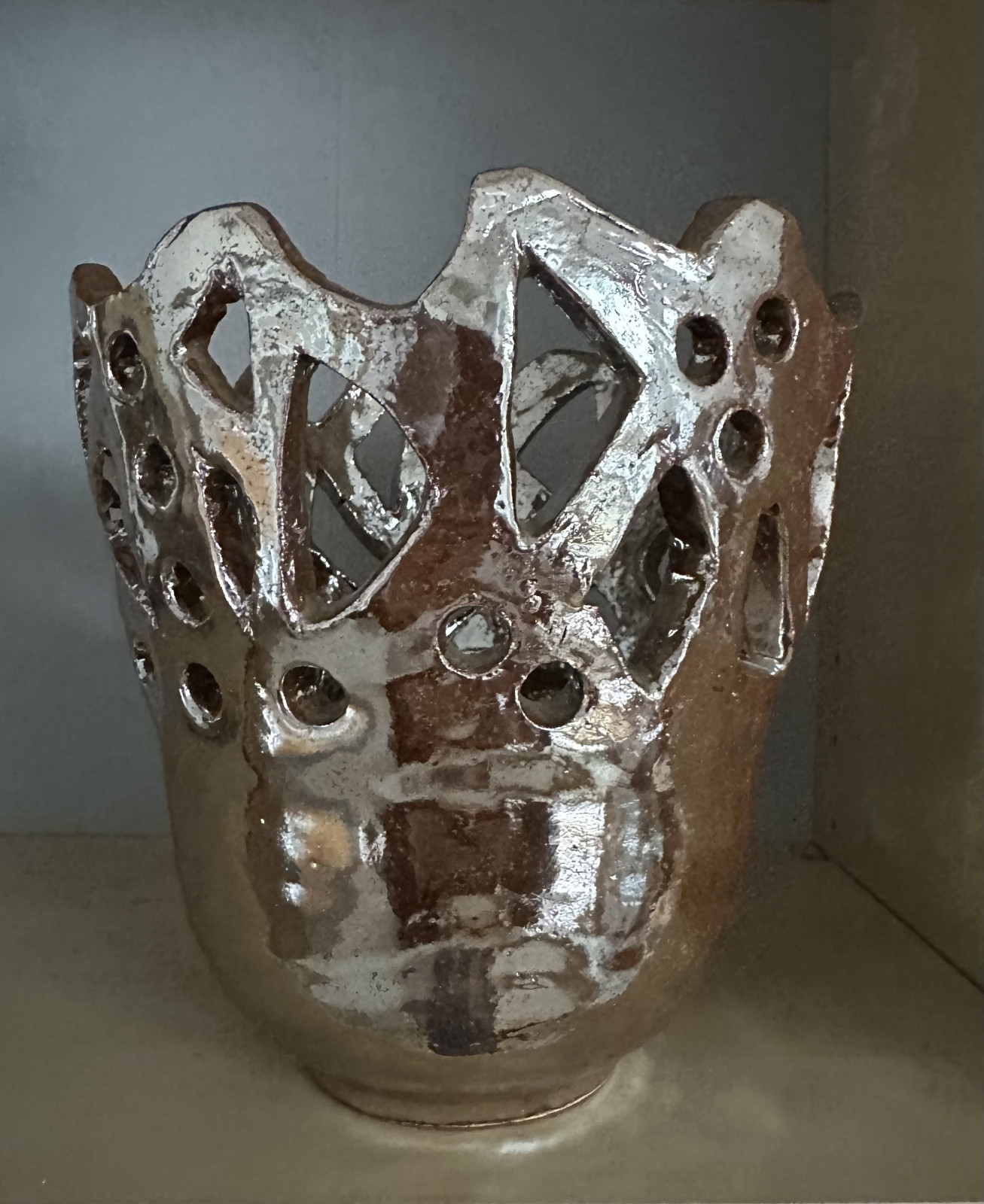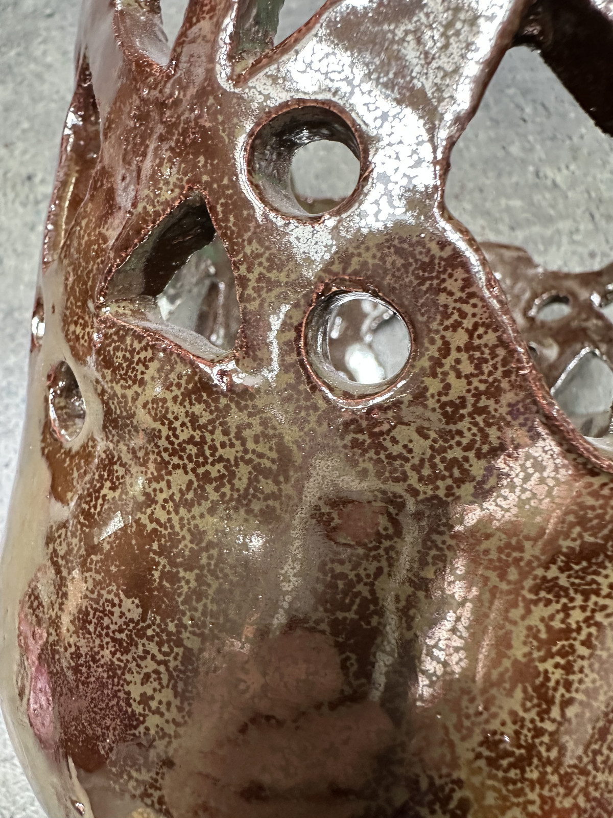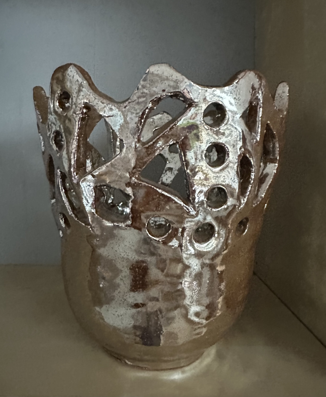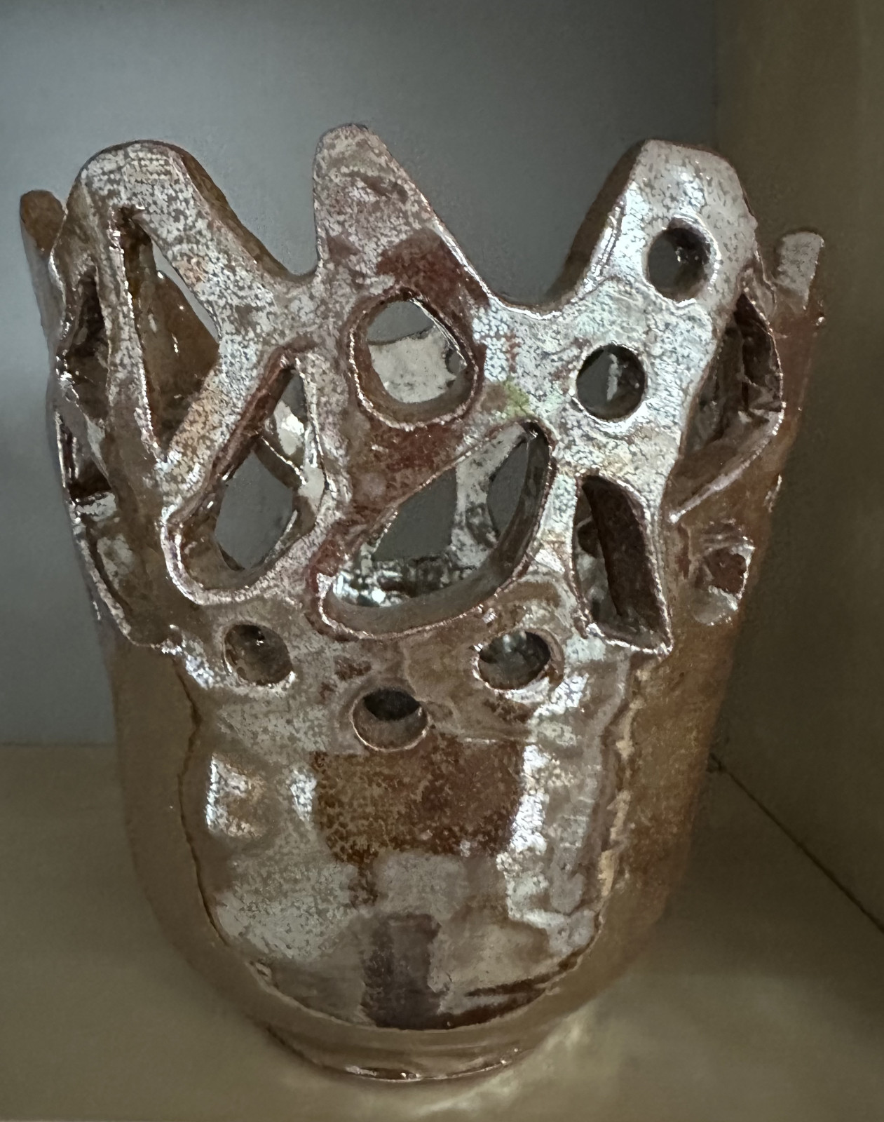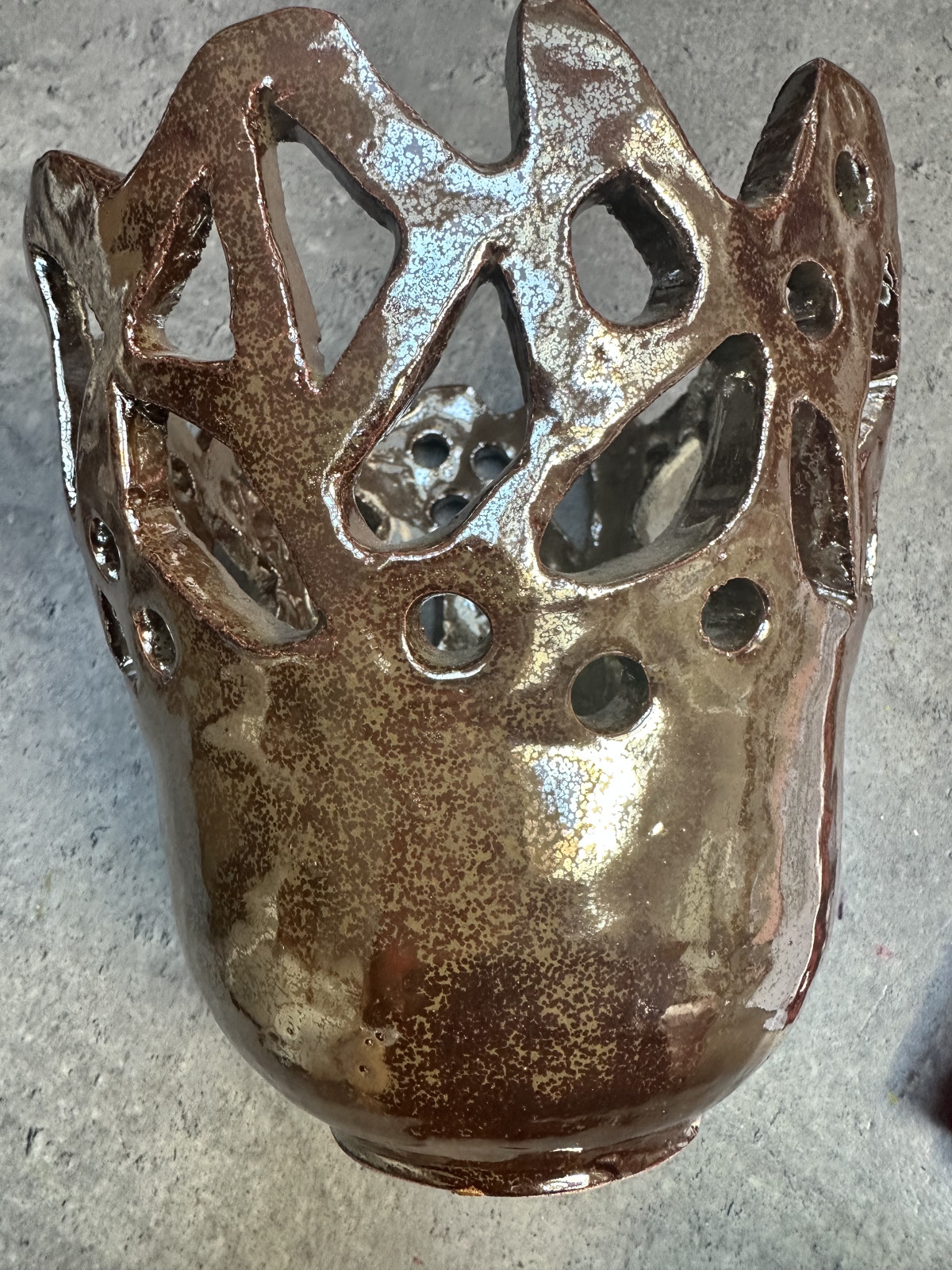 Ceramiczny wazon lub świecznik z wyciętymi ażurowymi wzorami, z każdej strony wygląda inaczej. Kolejną ozdobą jest błyszczące metaliczne szkliwo.