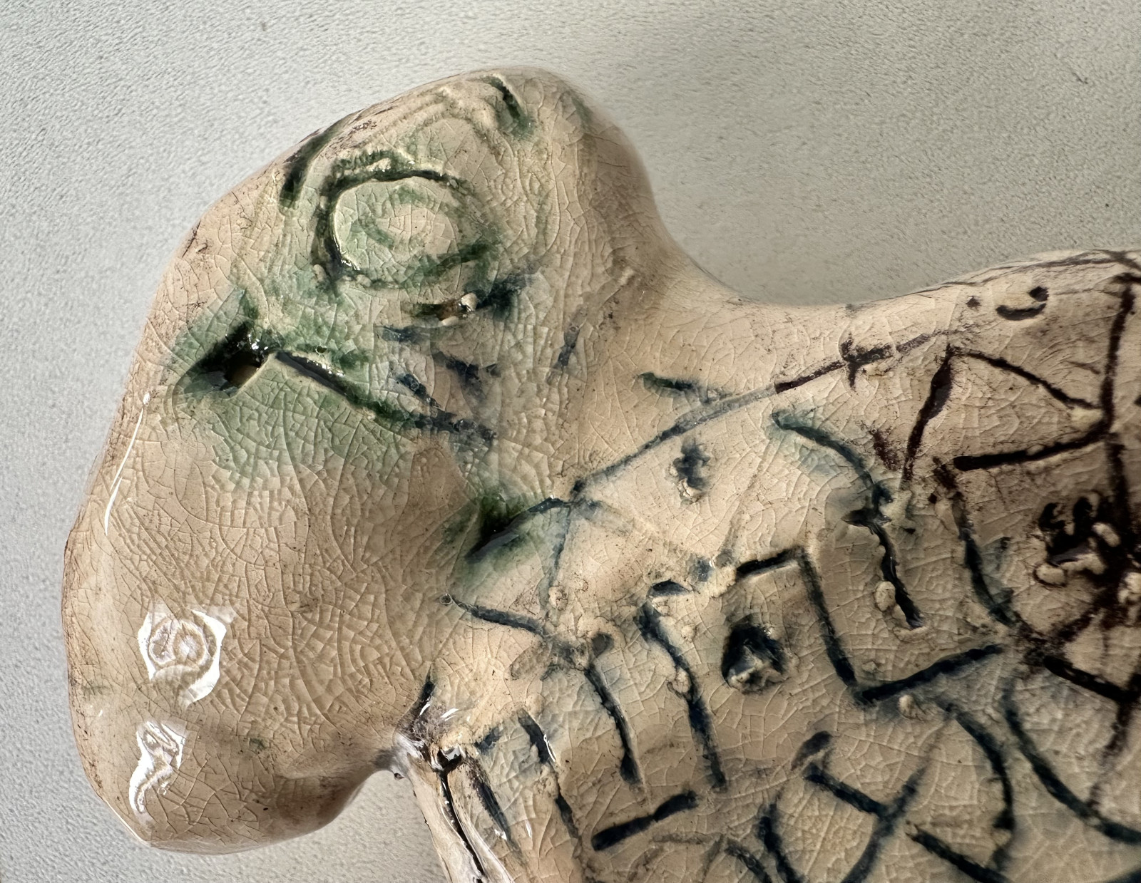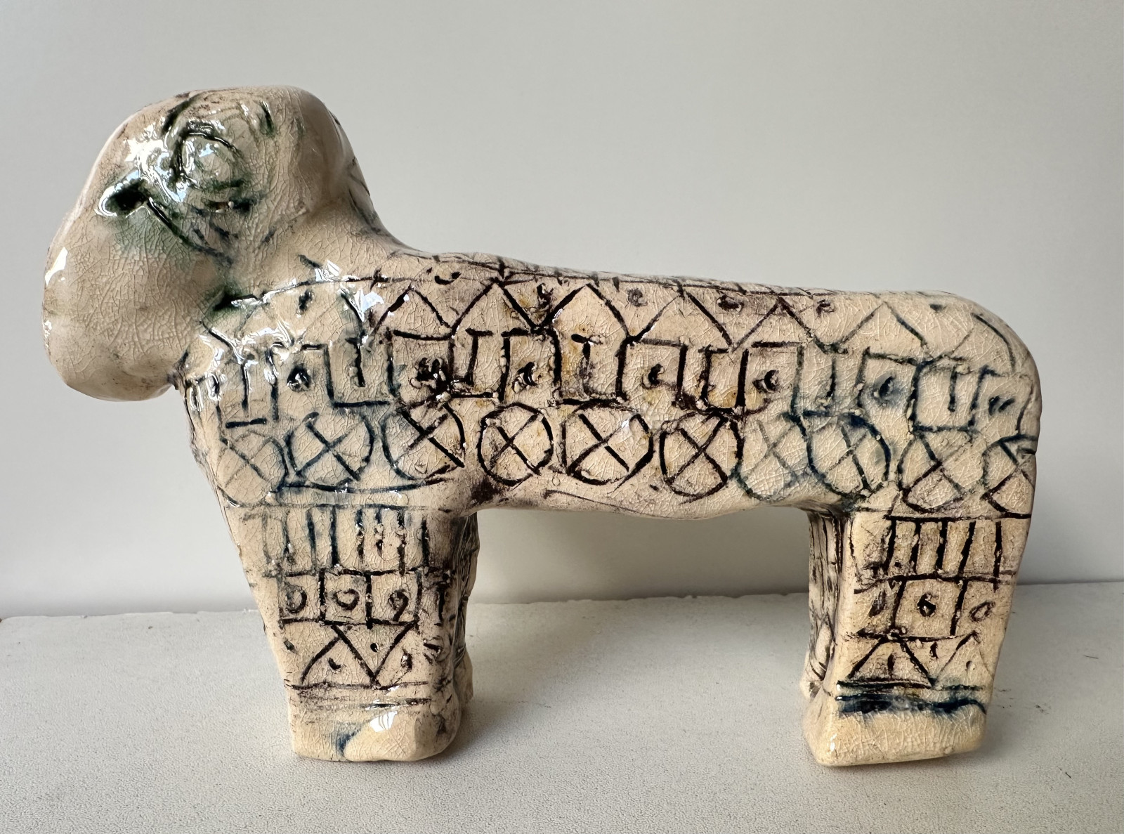 Ceramiczna figurka etnicznego zwierzo-barana, nienachalnej, męskiej urody, szkliwiona, robiona i wypalana w profesjonalnej pracowni ceramicznej.