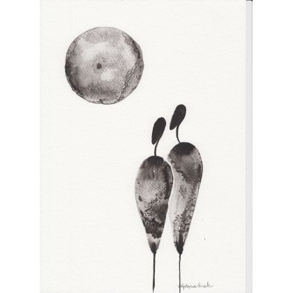 Rysunek czarnym tuszem na papierze akwarelowym o grubej fakturze, która doskonale komponuje się z delikatnością użytego tuszu.