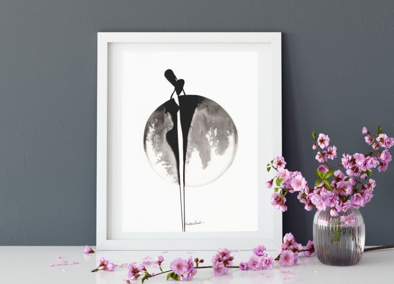 Malowany ręcznie tuszem na naturalnie białym papierze akwarelowym, którego faktura doskonale komponuje się z delikatnością użytego medium.