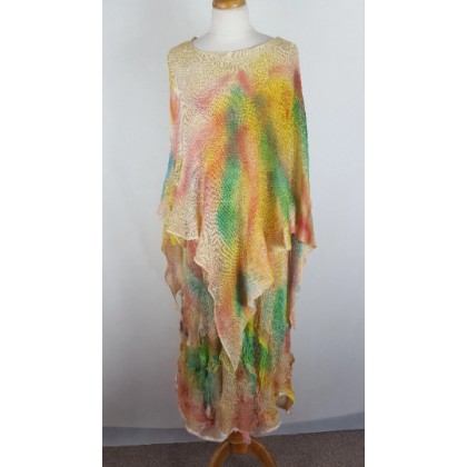 Strój artystyczny z dzianiny lnianej. Strój składa się z sukienki i poncza- narzutki. Całość w pięknych kolorach, ręcznie malowana, ciekawie dodatkowo ozdobiona. Sukienkę i ponczo można nosić osobno, lub razem, / foto / . Można też zakładać ponczo- narzutkę na sukienkę.