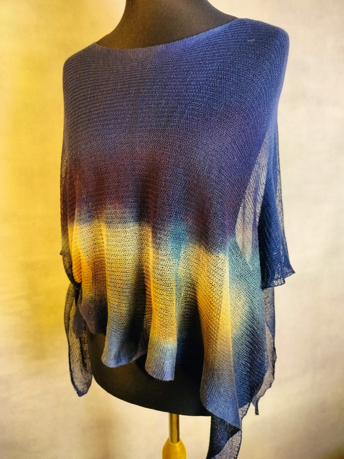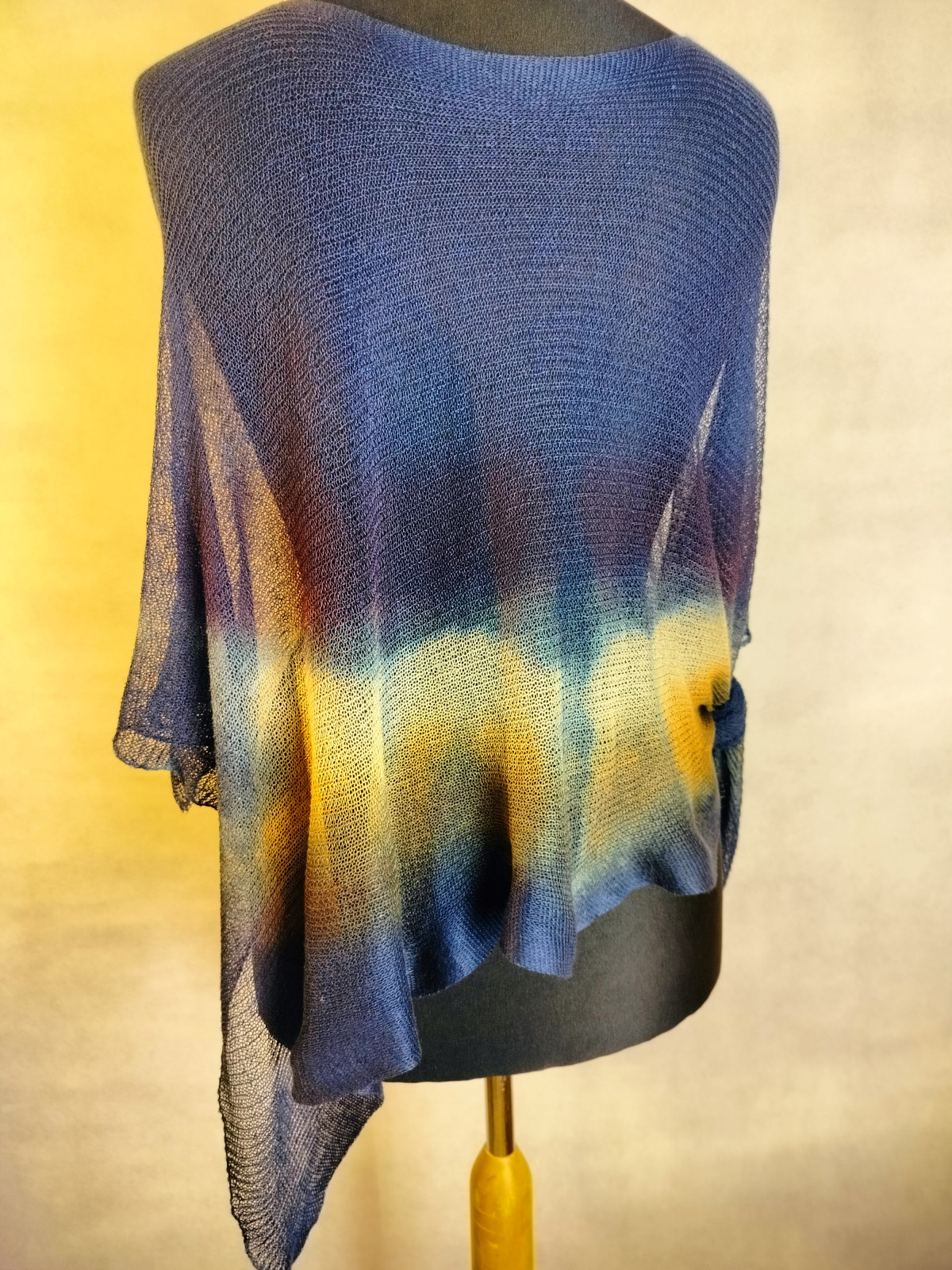 Ponczo w kolorze ciemnego granatu jest malowane ręcznie. Doskonaly stroj na kazdą okazje , i na kążdą pore roku.