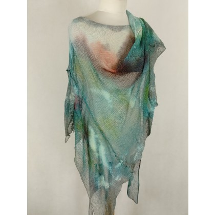 Ponczo z dzianiny 100% lnianej , malowane , kolor niebiesko-zielony z rozjaśnieniami i koloem fuksji