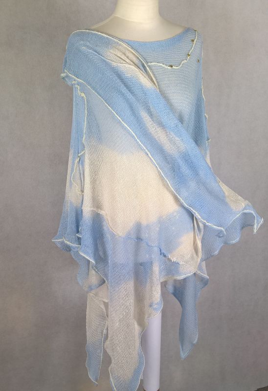 Ponczo z dzianiny 100% lnianej , malowane , kolor jasnoniebieski z rozjaśnieniem na dole poncza. Aplikacja z miedzianych gwiazdek, obszywane bawełnianym sznurkiem, z przeszyciami. nadającym indywidualny charakter .