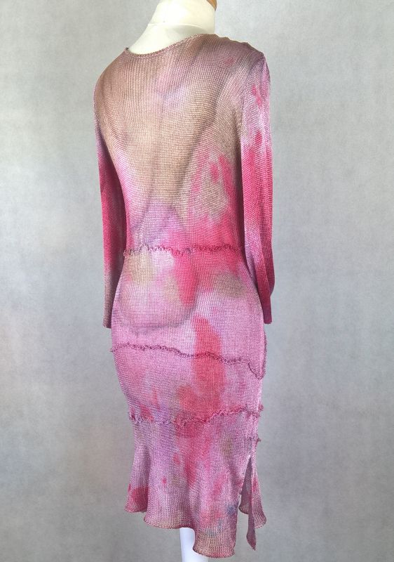 Sukienka wykonana z jedwabiu wiskozowego 50% i lnu 50%, na dole rozcięcia, z przeszyciami. Efektowne wiązanie na dekolcie Sukienka ręcznie malowana. Najlepiej zaprezentuje się sylwetce . S, lub M,