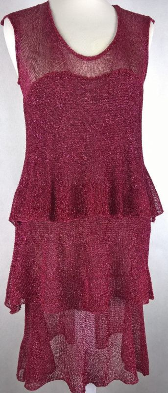 Sukienka wykonana z cienkiej dzianiny z jedwabiu wiskozowego z dodatkiem lureksu w tym samym kolorze malinowo -wiśniowym,