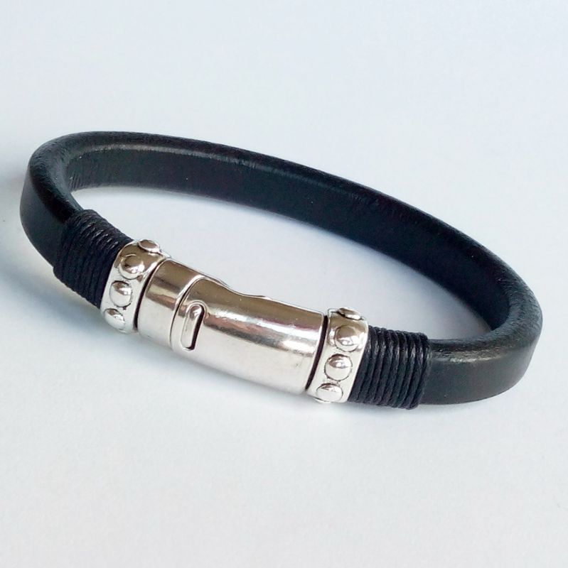 Klasyczna a zarazem bardzo elegancka męska bransoletka z grubego naturalnego rzemienia typu Regaliz, szykownie zdobiona, zapinana na wyjątkowo solidne zapięcie magnetyczno-zatrzaskowe.