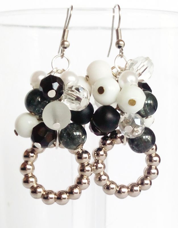 Bardzo efektowne bogato zdobione kolczyki, wykonane z różnego rodzaju koralików, zebranych w obfite cudownie zwisające grono zwieńczone ozdobnym elementem.