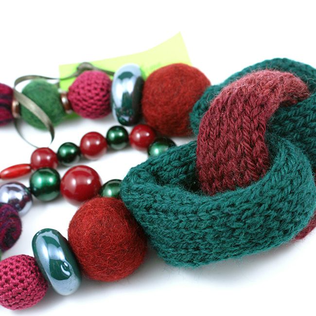 Naszyjnik wykonany z kul filcowych, drewnianych oplecionych na szydełku , akrylowych oraz Łańcucha wykonanego z elementów wykonanych ręcznie na drutach.