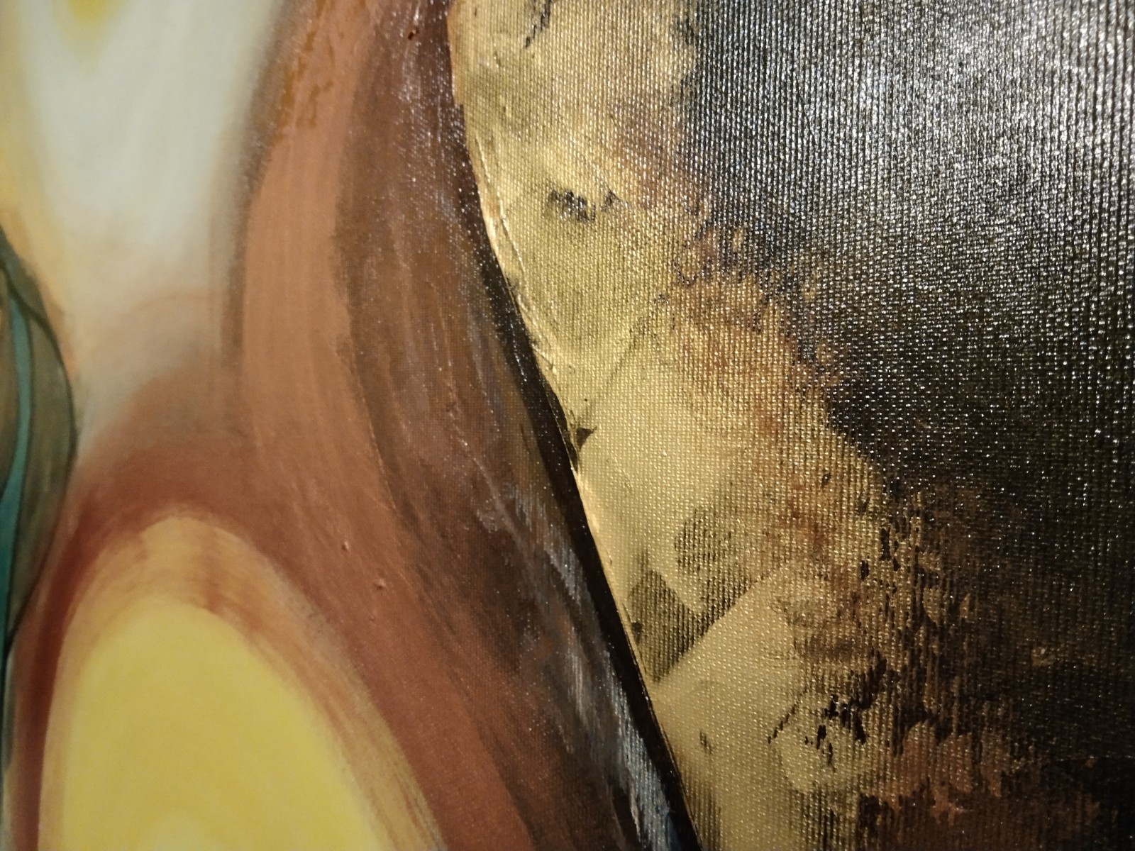 Abstrakcyjny obraz akrylowy na kwadratowym płótnie bawełnianym o wymiarach 80x80x2cm. Odważne linie, złocenia, elementy męskiej , twardej siły i elastycznej kobiecości z kulą ciepłej pełni przyciągającej ich do siebie lub też w zależności od nastroju, sferą próżni otoczonej ognistym kręgiem trzymającym kochanków na bezpieczną odległość. Dowolność i zabawa w interpretację jest atutem dzieła. Gruba warstwa farby, wyraziste pociągnięcia szpachelki, złocenia i wielobarwność doskonale skomponują się z nowoczesnym wnętrzem i wzbogacą stonowany salon lub gabinet. Praca jest zabezpieczona werniksem, sygnowana monogramem artystki ?Mb?21? oraz tytułem i datą wykonania na odwrocie.
