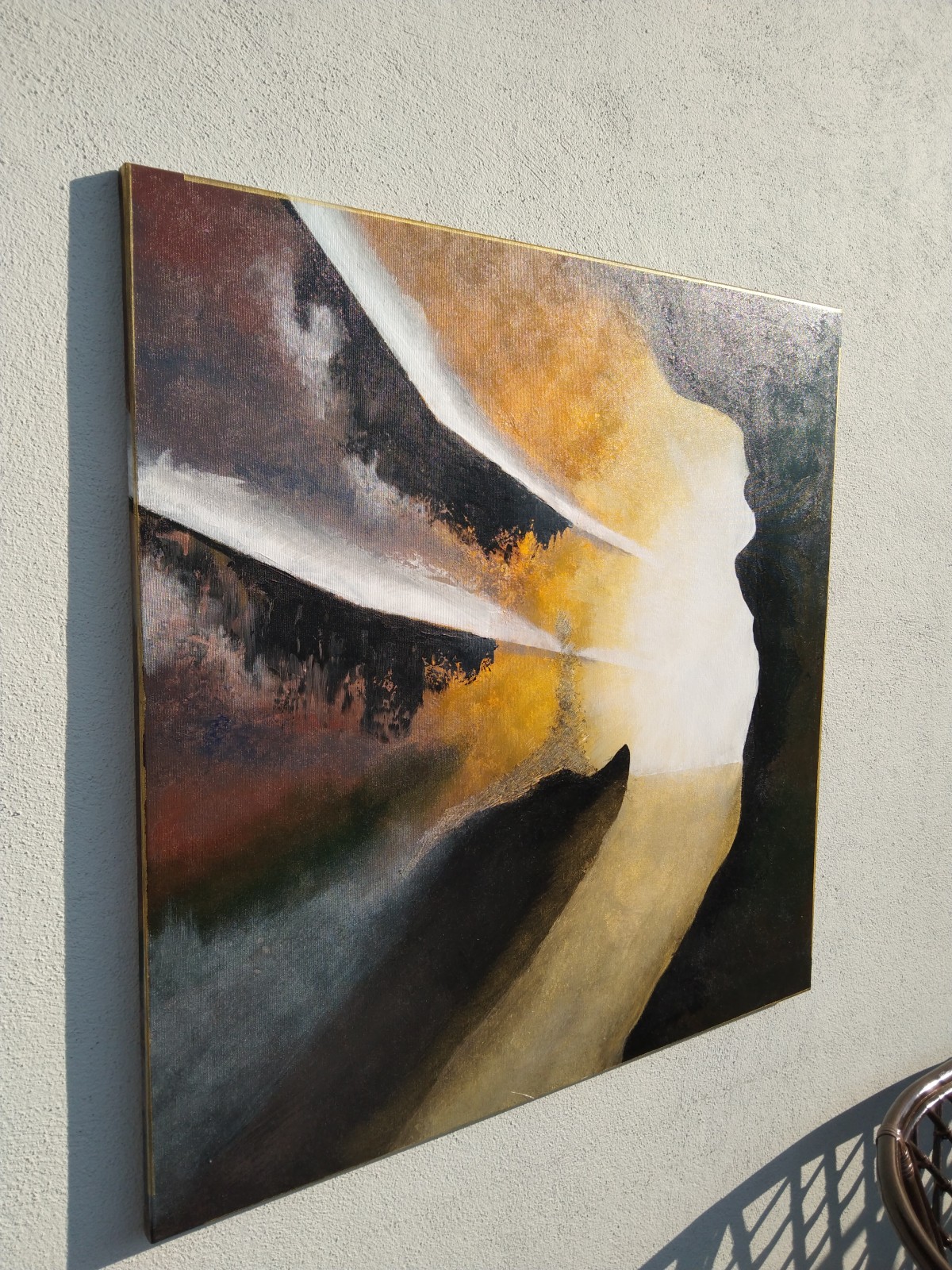 Moment odnalezienia światła, wyjścia z jaskini, zmaterializowania duszy w blasku na krawędzi ciemności i jasności, uświadomienie sobie dualności swojej natury. Tematyką malunek nawiązuje do jungowskiej koncepcji jednostki konfrontującej się z własnym cieniem jako drogi rozwoju. Obraz jest malowany akrylem, różnorodna faktura czyni go tym bardziej interesującym, uważny odbiorca dostrzeże odcienie głębokiego granatu, zieleni, uroku dodają subtelne złocenia w strefie światła. Wymiary obrazu to 80x80x2cm, sygnowany z przodu monogramem artystki ?Mb?21? oraz tytułem i datą ukończenia obrazu na odwrocie. Jest częścią kwartetu malarskiego o podobnej tematyce. Może okazać się inspirującym prezentem dla osoby np. w przełomowym momencie życia. Obraz z zamalowanymi bokami i eleganckimi złoceniami na krawędziach, gotowy do powieszenia.