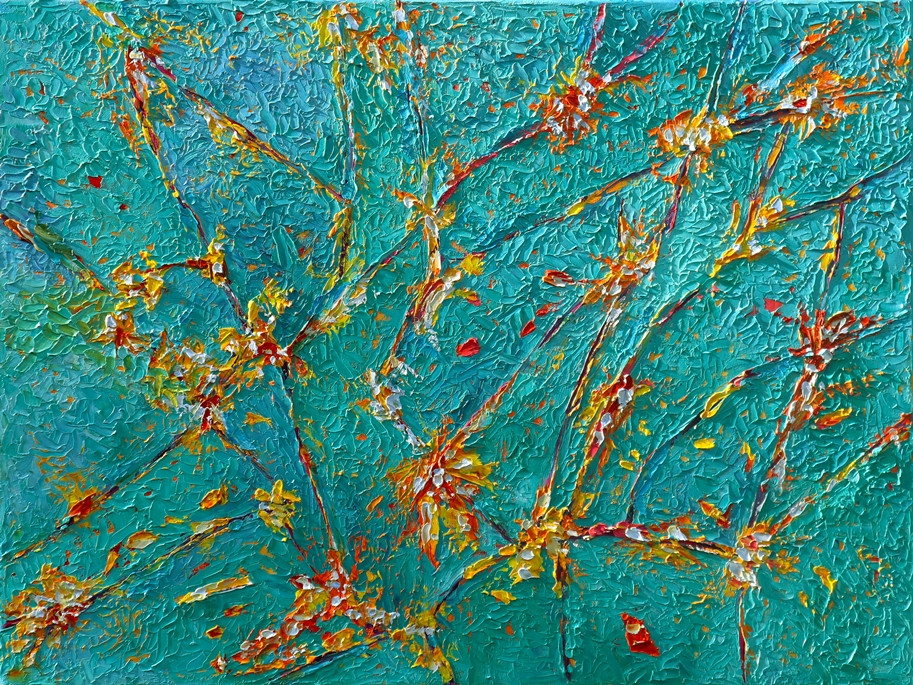 Nowocześnie namalowany obraz w błękitno zielonej tonacji. Grube pociągnięcia pędzla, widoczna faktura. Technika impasto. Obraz jest sygnowany, opisany na odwrocie. Boczne krawędzie są zamalowane w kolorze kompozycji, więc obraz nie wymaga ramy. Można go od razu powiesić na ścianie bez ramy (ma z tyłu zawieszkę). Obraz energetyczny, ożywiający wnętrze. Polecamy jako obraz do sypialni, do dekoracji stylowego salonu albo jako obraz na prezent dla miłośników malarstwa natury.
