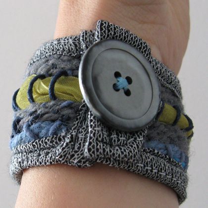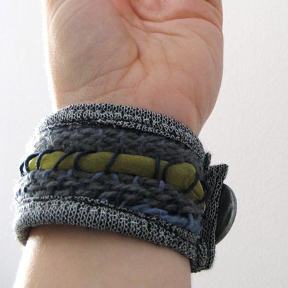 Bransoletka wykonana jest z tkaniny, którą utkałam na krośnie nicielnicowym. Do wytkania użyłam przędz tkackich i wstążkę satynową. Tkaninę o układzie pasowym obszyłam tkaniną.