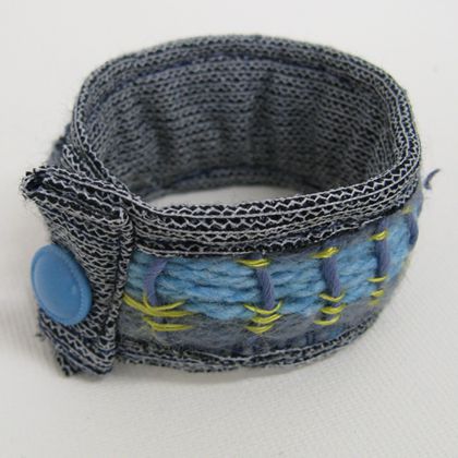 Bransoletka wykonana jest z tkaniny, którą utkałam na krośnie nicielnicowym. Tkaninę o układzie pasowym obszyłam miękką tkaniną będącą włókniną o ciekawym splocie i kolorze.