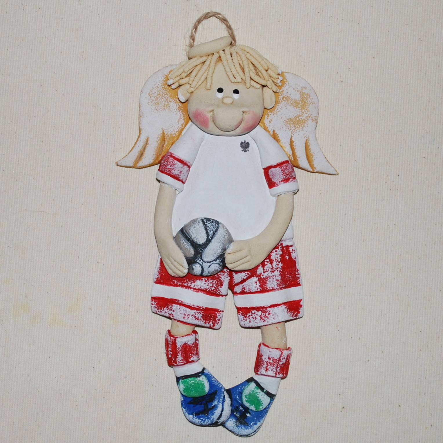 Aniołek w stroju sportowym, wykonany z masy solnej, termicznie utwardzany, malowany, z tyłu zabezpieczony lakierem i zapakowany ozdobnie w woreczek z celofanu. Na życzenie klienta istnieje możliwość wpisania imienia zawodnika na jego koszulce - gratis. Wielkość, bez zawieszki (sznurek konopny),ok. 19-22cm. Zapraszam