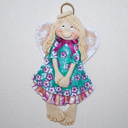 Aniołek na szczęście. Wykonany z masy solnej, termicznie utwardzany, malowany, z tyłu zabezpieczony lakierem i zapakowany ozdobnie w woreczek z celofanu. Wielkość, bez zawieszki (sznurek konopny),ok. 19-21 cm. Zapraszam