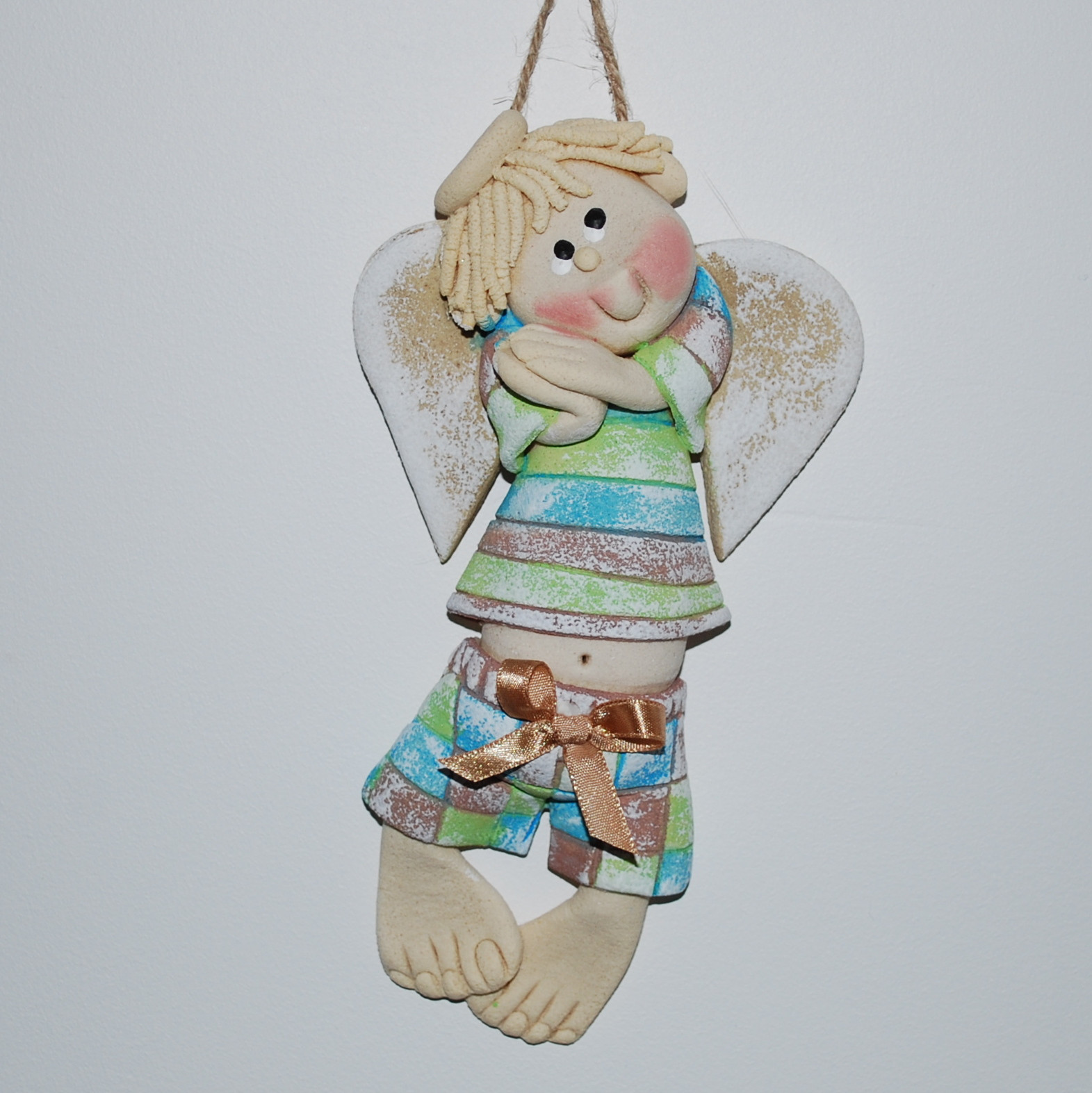 Kolorowy aniołek - rękodzieło - każdy inny. Wykonałam go z myślą, że sprawdzi się jako wisząca, dekoracja pokoju dziecięcego lub będzie doskonałym prezentem dla dziecka z okazji: urodzin, chrzcin, komunii świętej lub prezentem świątecznym. Do wykonania anioła wykorzystałam masę solną, samodzielnie ją “kulając” i malując. Posiada zawieszkę w postaci dratwy lub sznurka konopnego i z tyłu zabezpieczony jest lakierem akrylowym. Do wysyłki pakuję anioła w celofanowy woreczek i przewiązuję rafią naturalną. Każdy z aniołów przechodzi przez moje ręce co najmniej 10 razy i to chyba mnie inspiruje do wymyślania nowych wzorów. Na Państwa życzenie postaram się wykonać anioła zgodnie zapotrzebowaniem. Informację o zamówieniu należy przesłać do galerii. Wielkość, bez zawieszki ok. 16-18 cm. Zapraszam