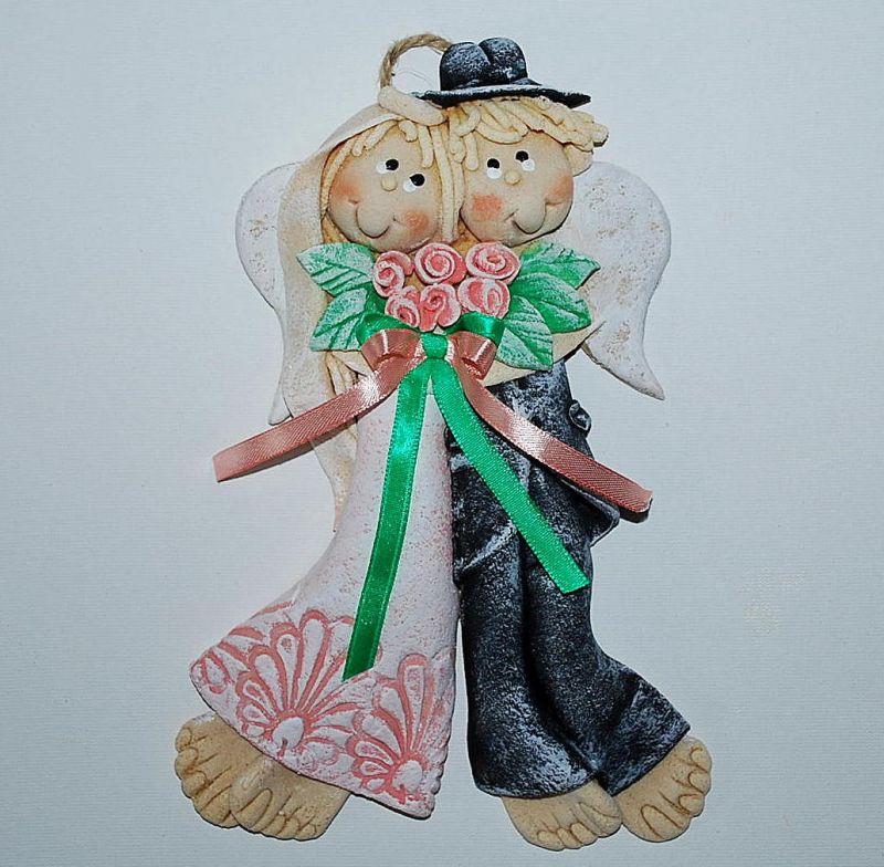 Para aniołków ślubnych z masy solnej może stać się miłym prezentem dla nowożeńców bądź nieprzeciętnym upominkiem z okazji jubileuszu. Wielkość aniołków - bez zawieszki - ok. 19-22 cm. Zapraszam.