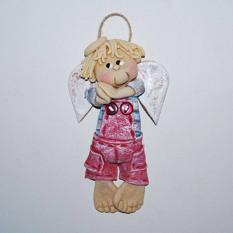 Aniołek - chłopczyk, zapakowany ozdobnie w woreczek z celofanu. Wykonany z masy solnej, termicznie utwardzany, malowany i lakierowany. Wielkość, bez zawieszki (sznurek konopny), 16-17 cm. Zapraszam