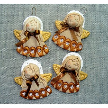 Aniołki na każdą okazję, także nieprzeciętny upominek dla naszych gości. Mogą stać się ozdobą naszego domu i być atrakcyjną świąteczną dekoracją. Wykonane jest z masy solnej, termicznie utwardzane, malowane i lakierowane. Wielkość, bez zawieszki, ok 8-9 cm. Komplet - 4 szt.