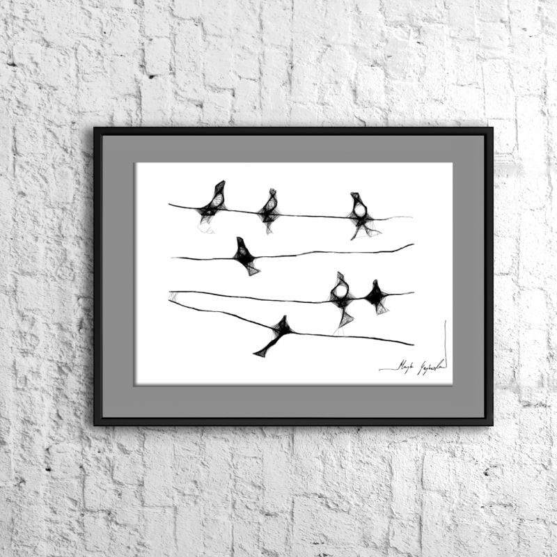 Grafika wykonana techniką mieszaną na białym, matowym o lekko fakturowanej powierzchni, graficznym papierze Canson 160g. Gwarancja jakości w czasie długotrwałego przechowywania. Format 30x21 cm. Praca jest oprawiona - czarna, aluminiowa, satynowa rama oraz grafitowe passe partout. Gotowa do powieszenia na ścianie.