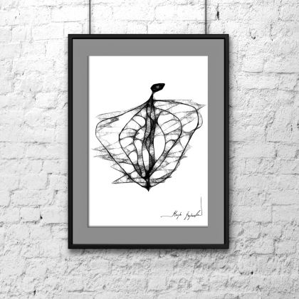 Grafika wykonana techniką mieszaną na papierze białym FABRIANO. Format 30x21cm. Grafika jest oprawiona - czarna, satynowa, aluminiowa rama oraz grafitowe passe partout.