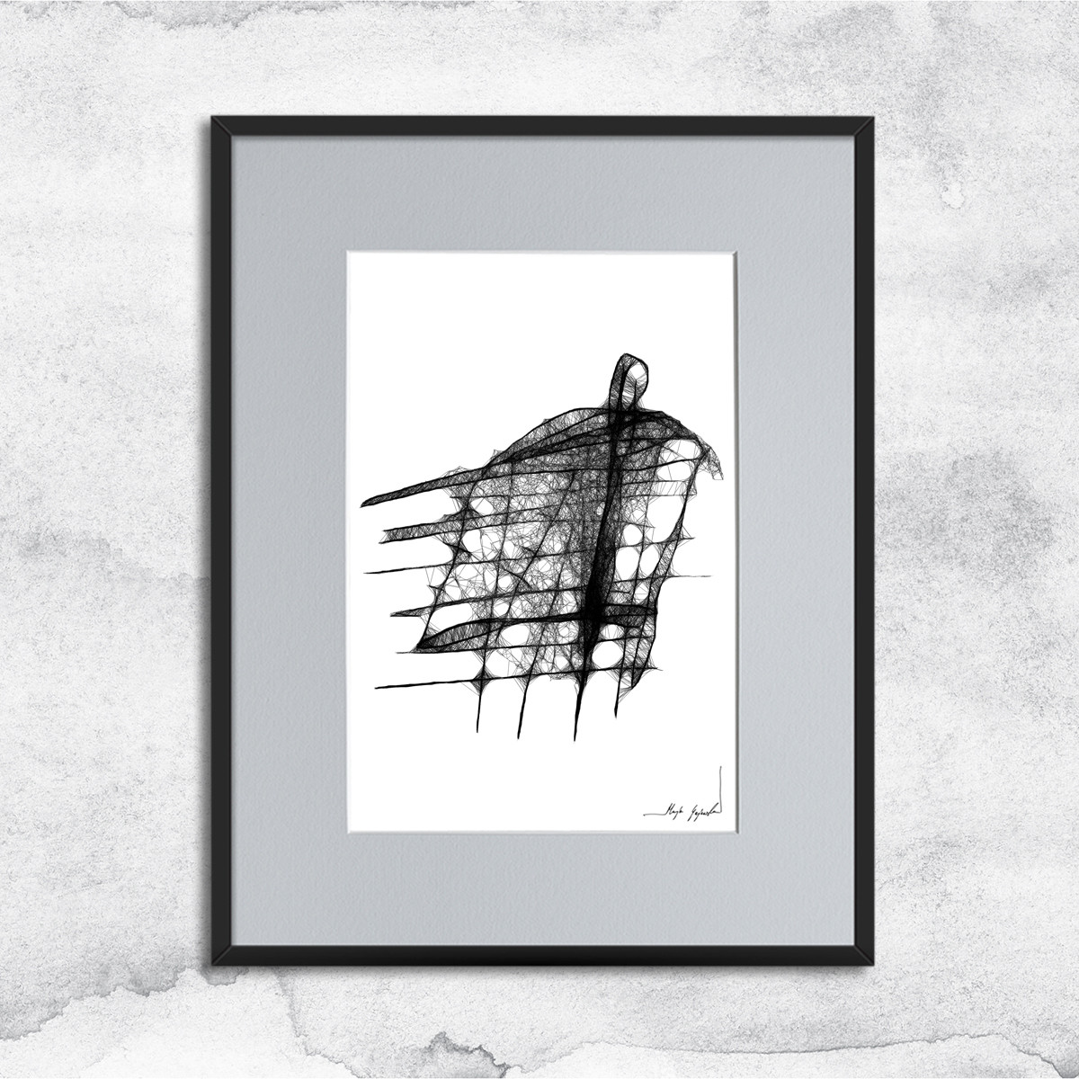 Grafika wykonana techniką mieszaną (giclée+rysunek isografem) na białym, matowym o lekko fakturowanej powierzchni, graficznym papierze Canson 160g. Unikalna kreska wygląda bardzo efektownie, zaś czarno-białe wykończenia wnętrz idealnie wpisują się w puste ściany nowoczesnych, minimalistycznych czy loftowych powierzchni.
