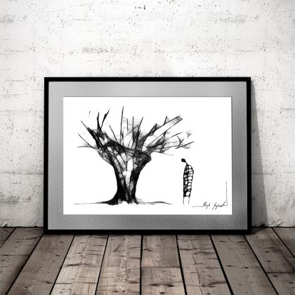 Grafika wykonana techniką mieszaną (giclée+rysunek isografem) na białym, matowym o lekko fakturowanej powierzchni, graficznym papierze Canson 160g.