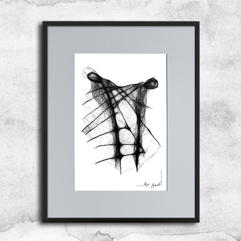 Grafika wykonana techniką mieszaną (giclée+rysunek isografem) na białym, matowym o lekko fakturowanej powierzchni, graficznym papierze Canson 160g. Unikalna kreska wygląda bardzo efektownie, zaś czarno-białe wykończenia wnętrz idealnie wpisują się w puste ściany nowoczesnych, minimalistycznych czy loftowych powierzchni.