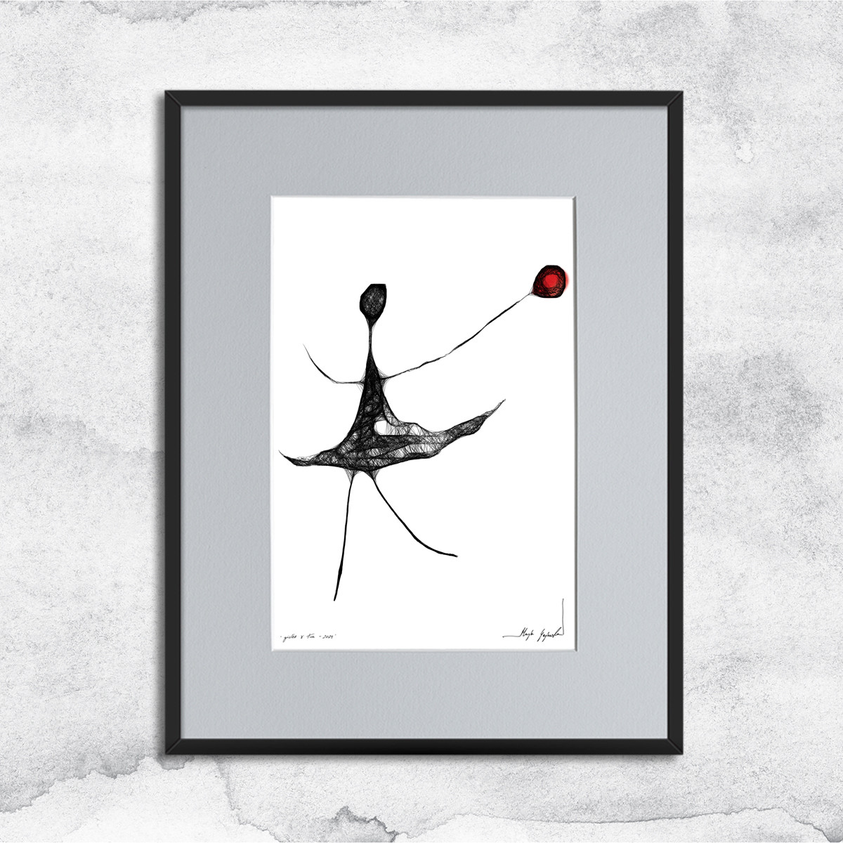 Praca jest oprawiona - czarna, aluminiowa rama oraz grafitowe passe partout. Front ramy stanowi szyba. Praca gotowa do powieszenia na ścianie.