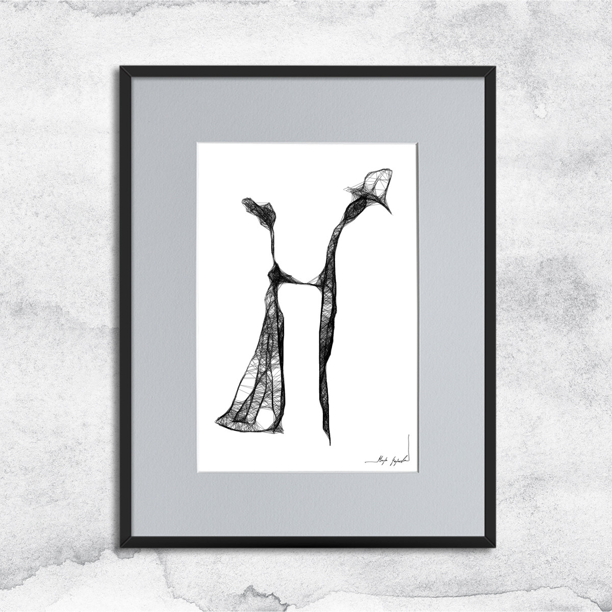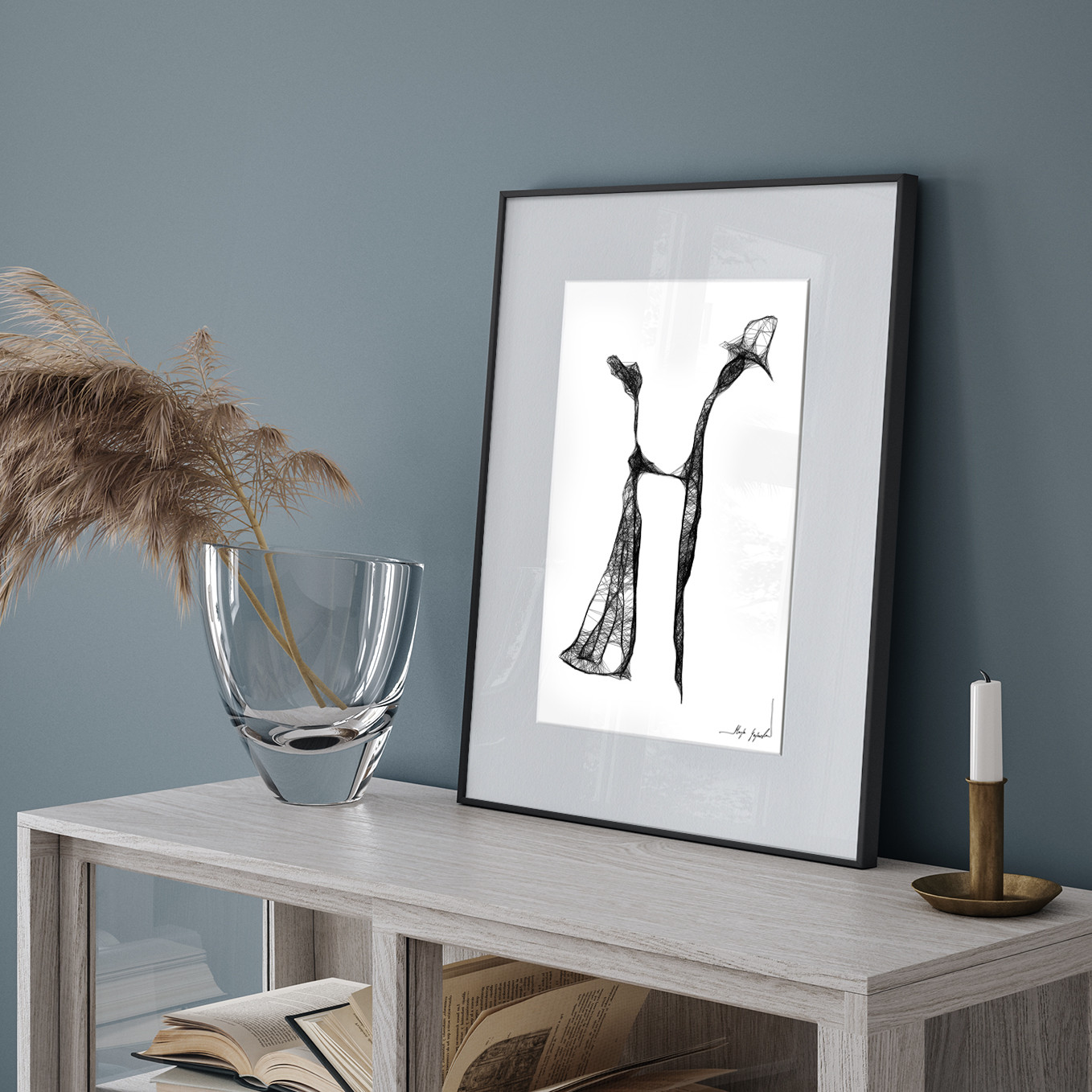 Grafika wykonana techniką mieszaną (giclée+rysunek isografem) na białym, matowym o lekko fakturowanej powierzchni, graficznym papierze Canson 250g. Unikalna kreska wygląda bardzo efektownie, zaś czarno-białe wykończenia wnętrz idealnie wpisują się w puste ściany nowoczesnych, minimalistycznych czy loftowych powierzchni.