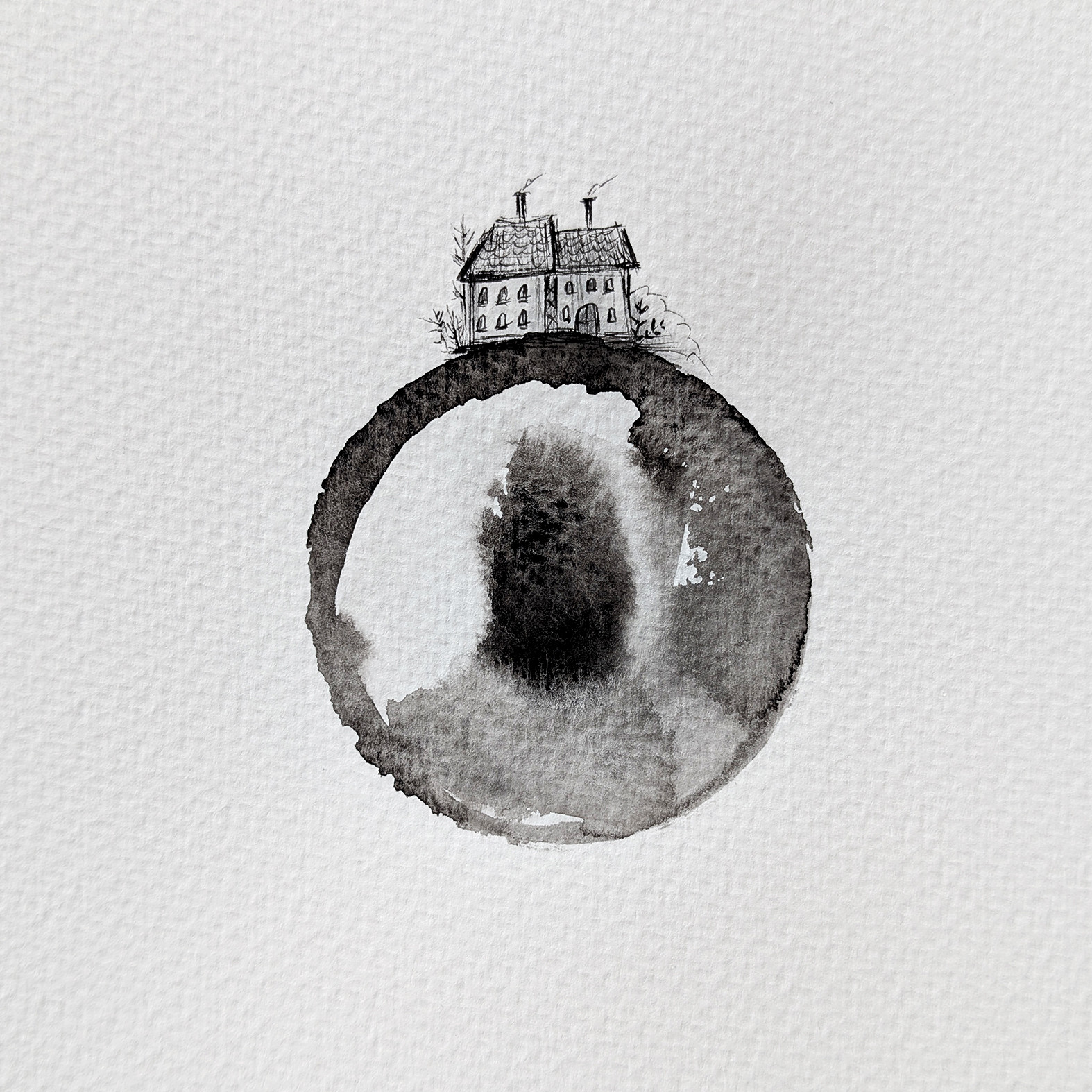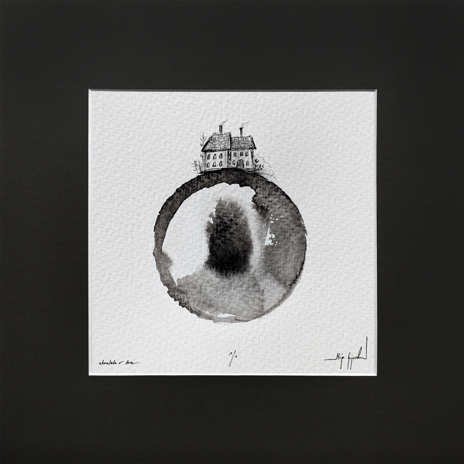 Ręcznie malowana akwarela z tuszem na białym, lekko fakturowanym papierze. Pojedyncza sztuka.