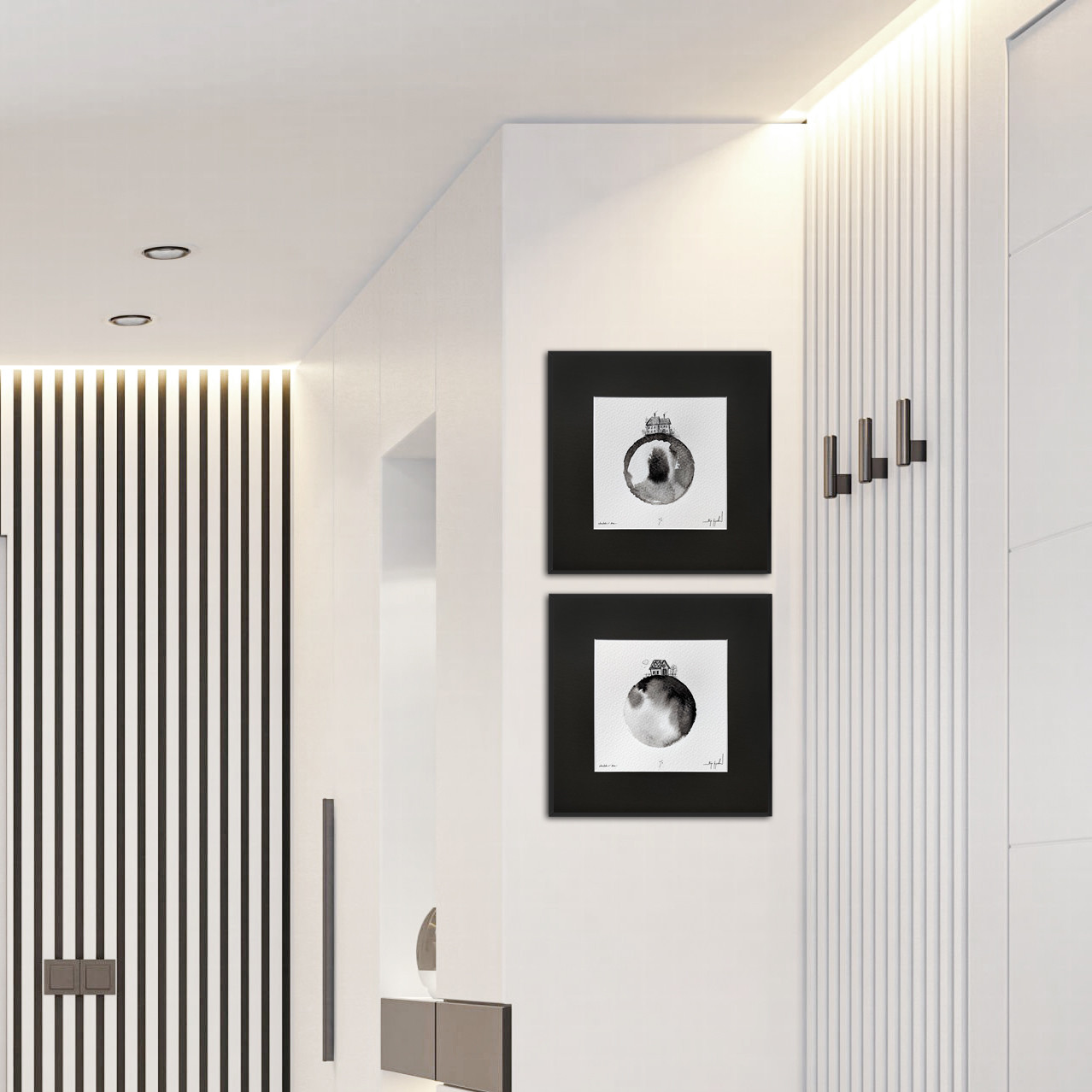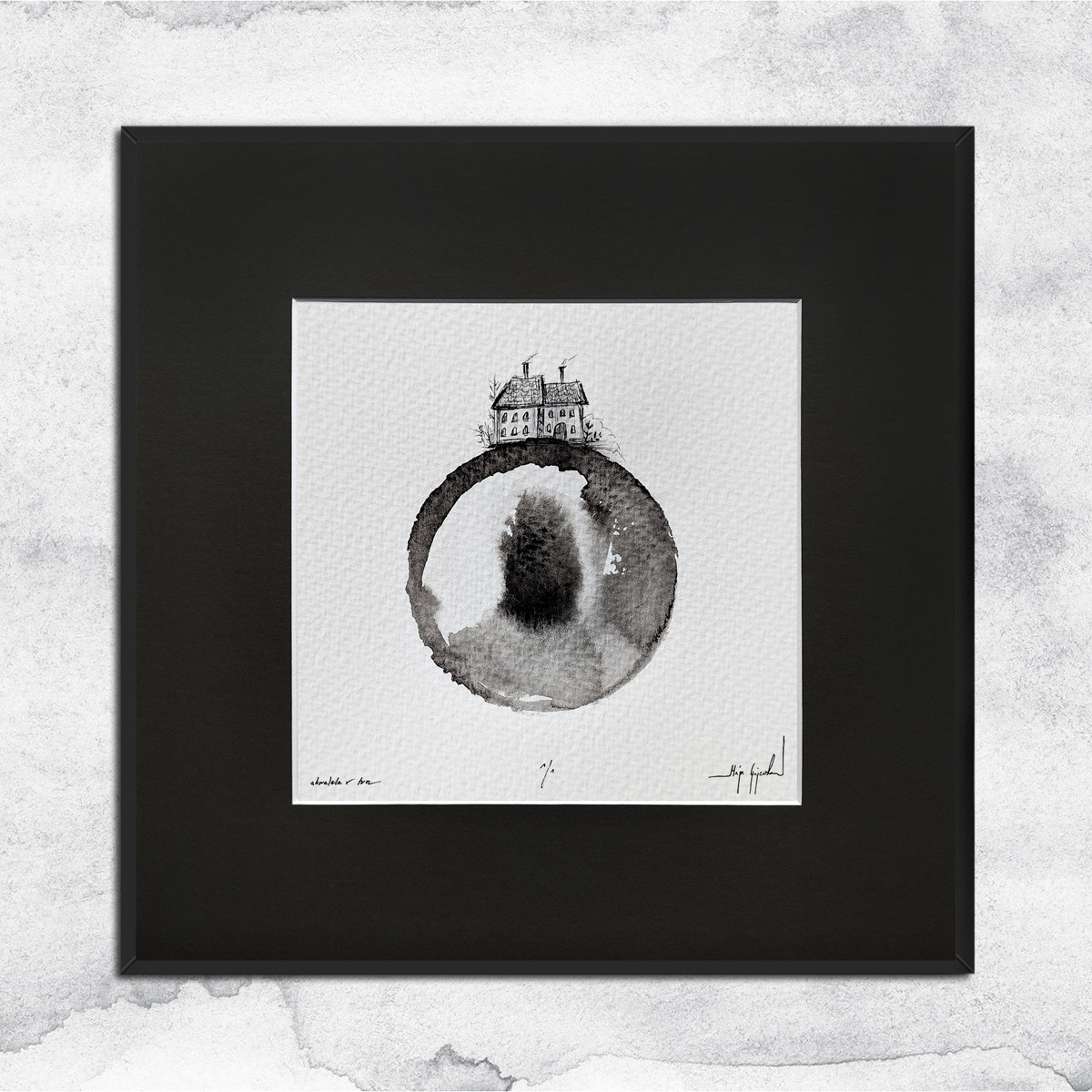 Praca oprawiona jest w antracytowe passe partout i czarną, aluminiową ramę. Gotowa do powieszenia na ścianie.