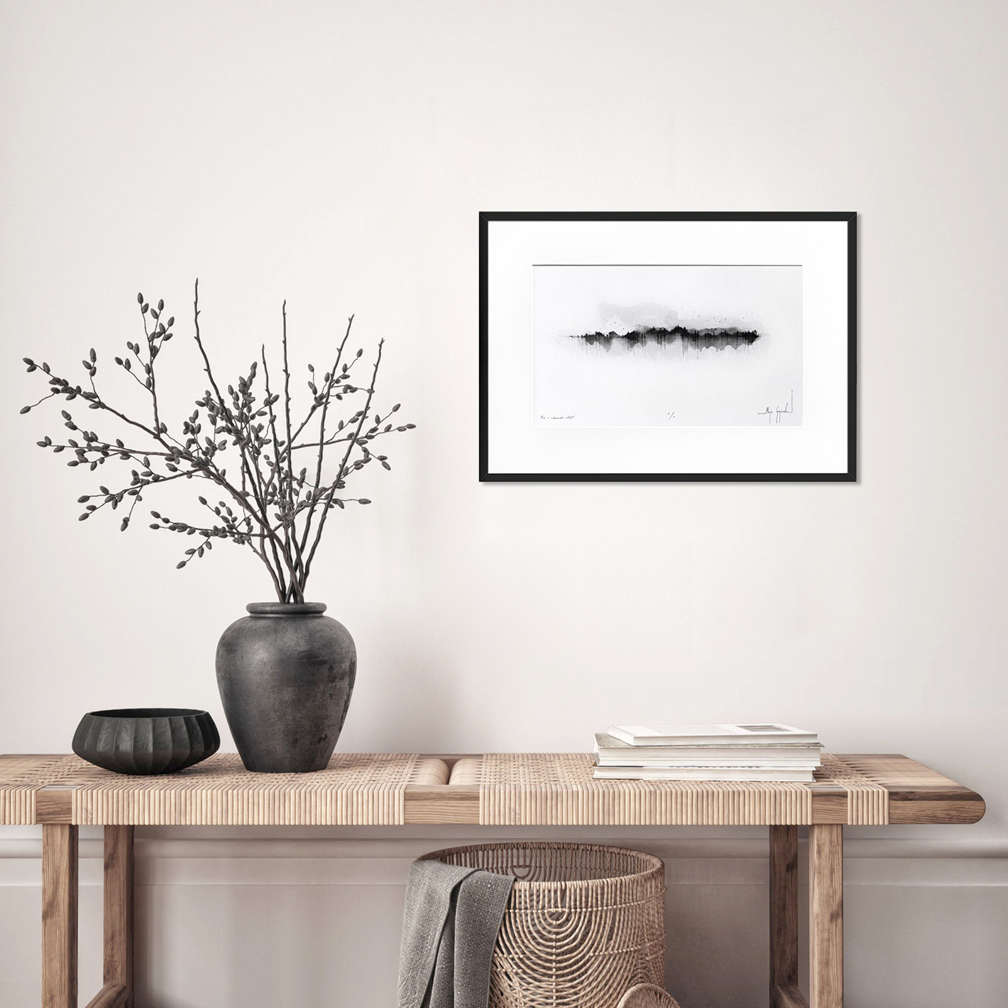 - rysunek oprawiony w białe passe partout i czarną, aluminiową ramę