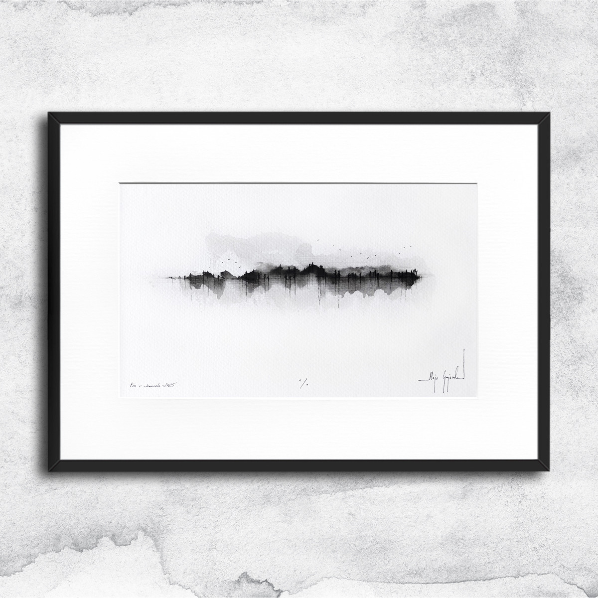 Każda z prac wykonana jest w pojedynczym egzemplarzu. Autorski rysunek wykonany w technice tusz i akwarela na białym, lekko fakturowanym, tradycyjnym papierze graficznym. Praca oprawiona jest w białe passe partout i czarną, aluminiową ramę.