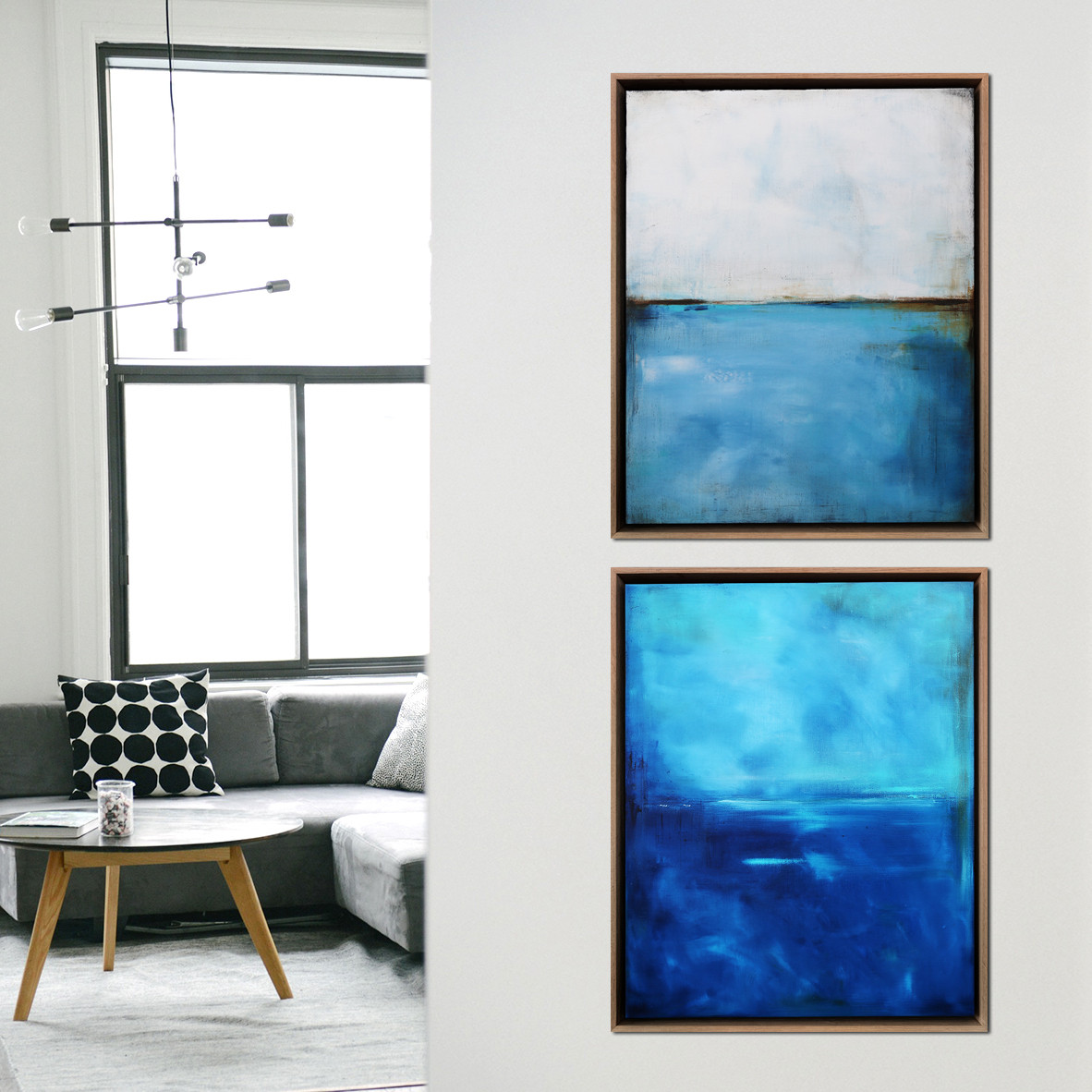 Abstrakcyjny obraz olejny z dominującą paletą barw delikatnego błękitu, turkusu i granatowego. Kolorystyka obrazu rozjaśni i doda świeżości salonowi lub sypialni oraz stworzy centralny punkt na ścianie.