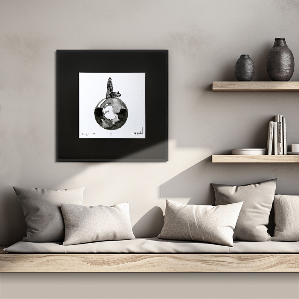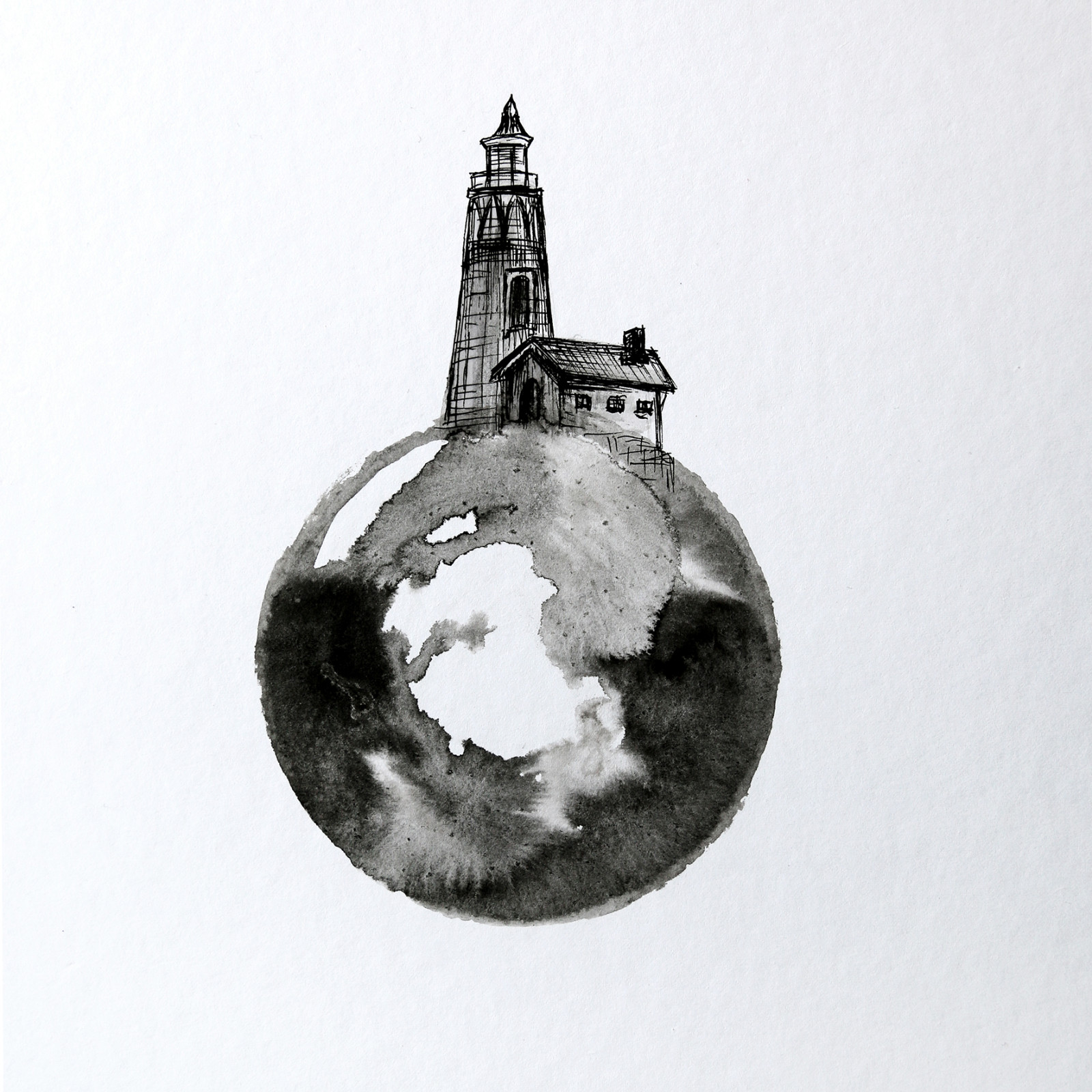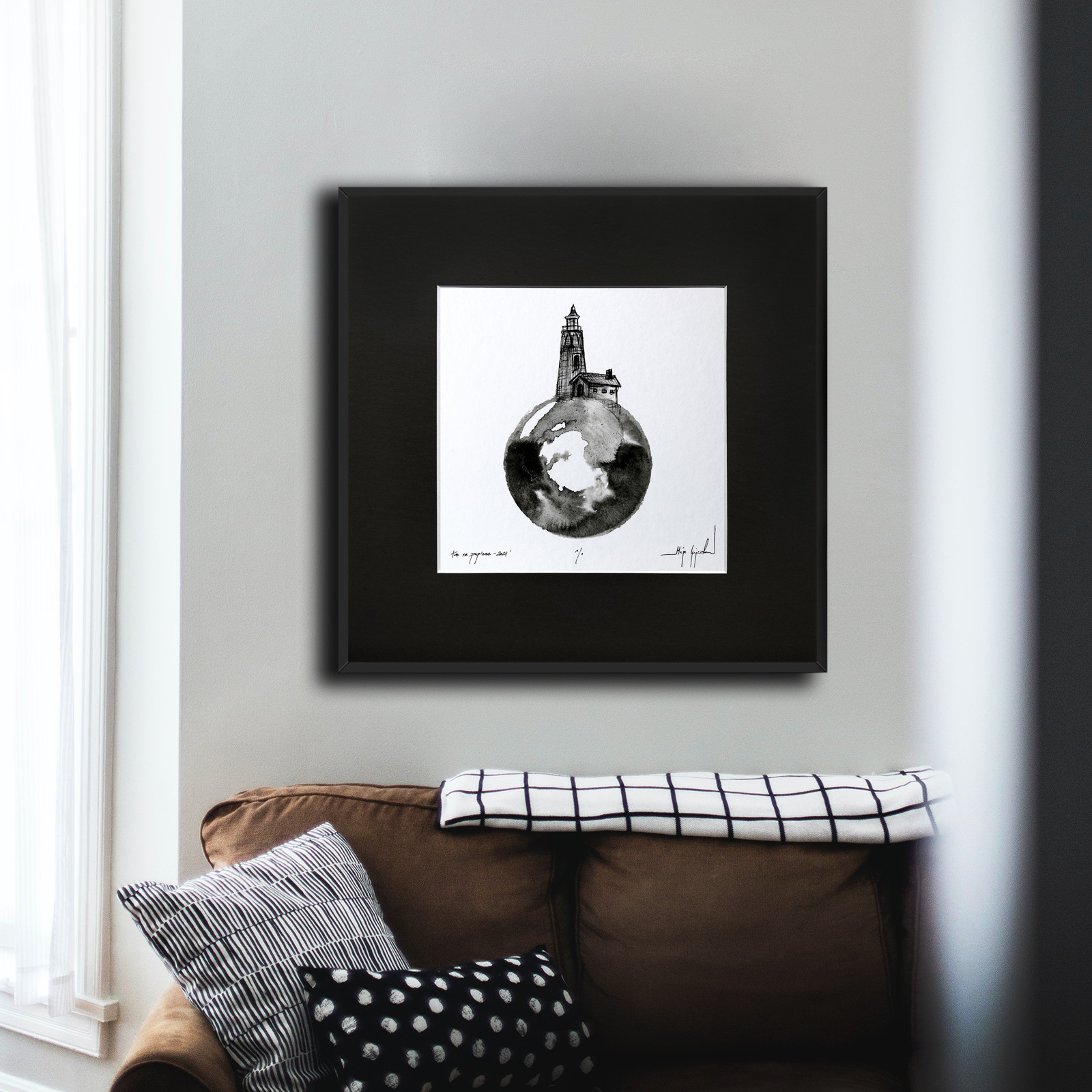 Minimalistyczny czarno-biały rysunek latarni morskiej. Pojedyncza sztuka.