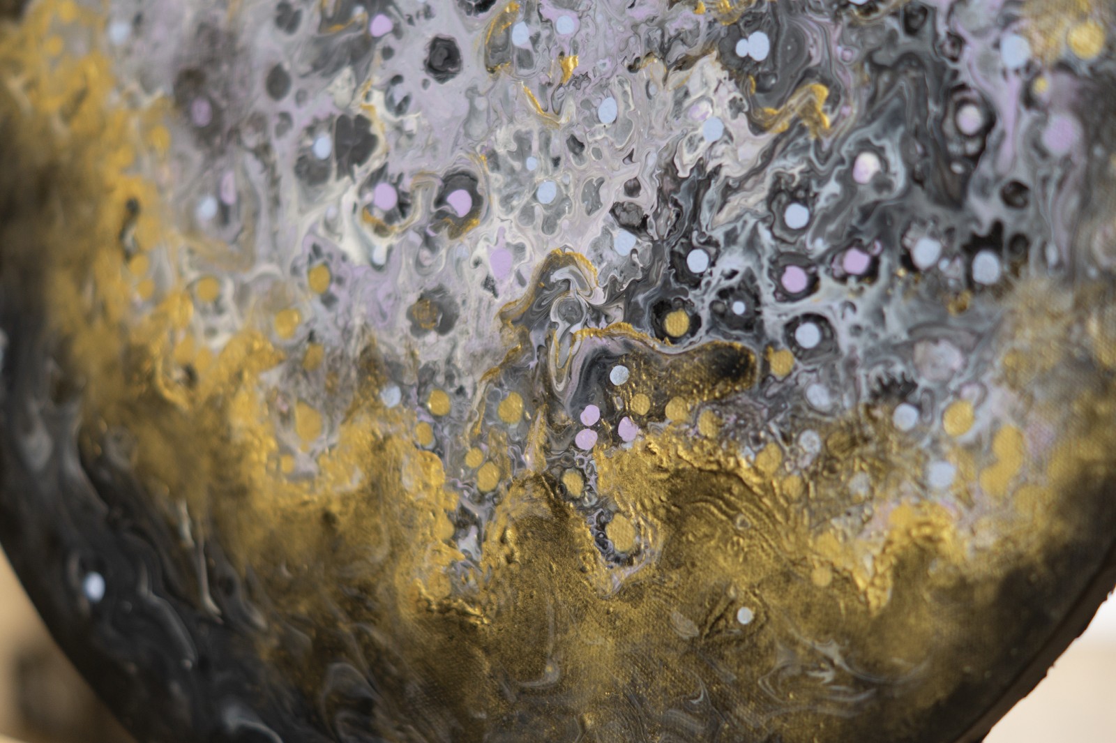 Obraz mojego autorstwa ze złotą farbą, malowany farbami akrylowymi na podobraziu malarskim o średnicy 40cm.