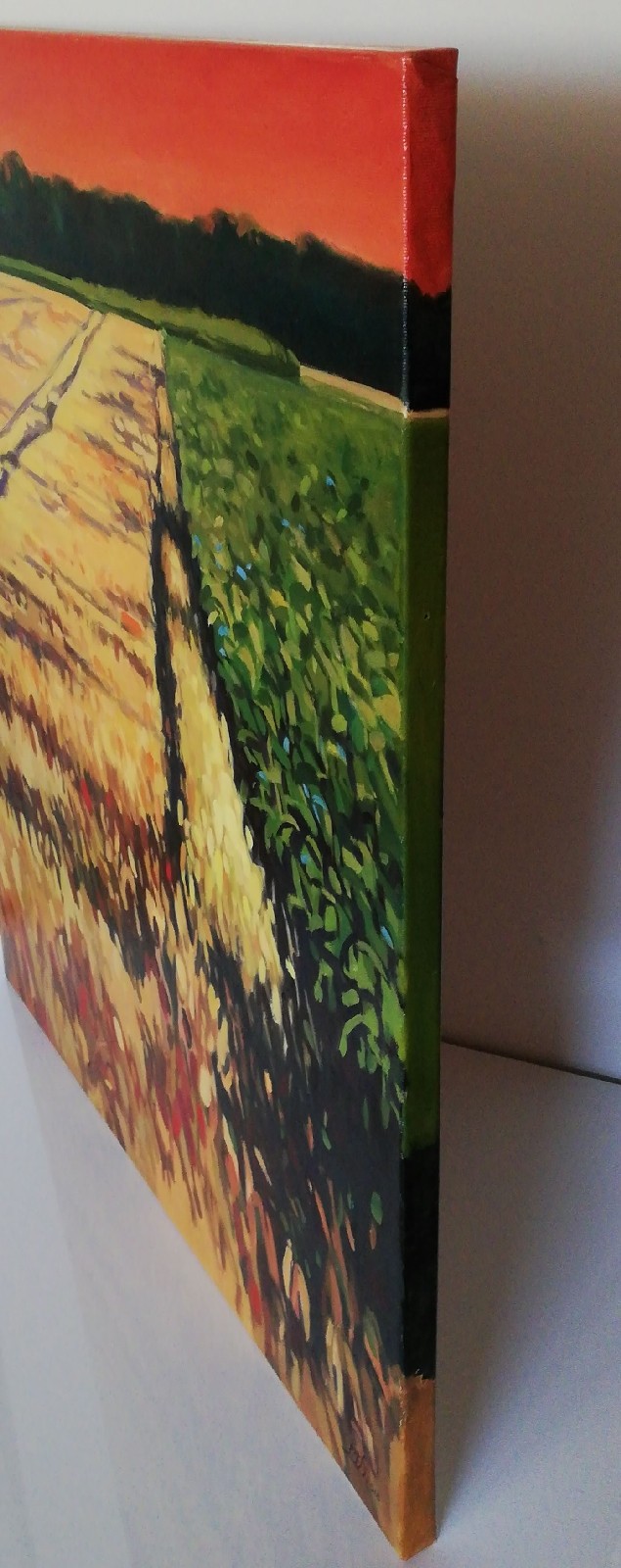 Obraz olejny na płótnie lnianym, wymiary 73 x 61, werniksowany, sygnowany. Boki obrazu pomalowane w kolorach kompozycji, nie wymaga oprawy, gotowy do zawieszenia. Obraz malowany ekspresyjnie, oparty na kontrastach kolorystycznych i walorowych, oddaje atmosferę schyłku letniego dnia.
