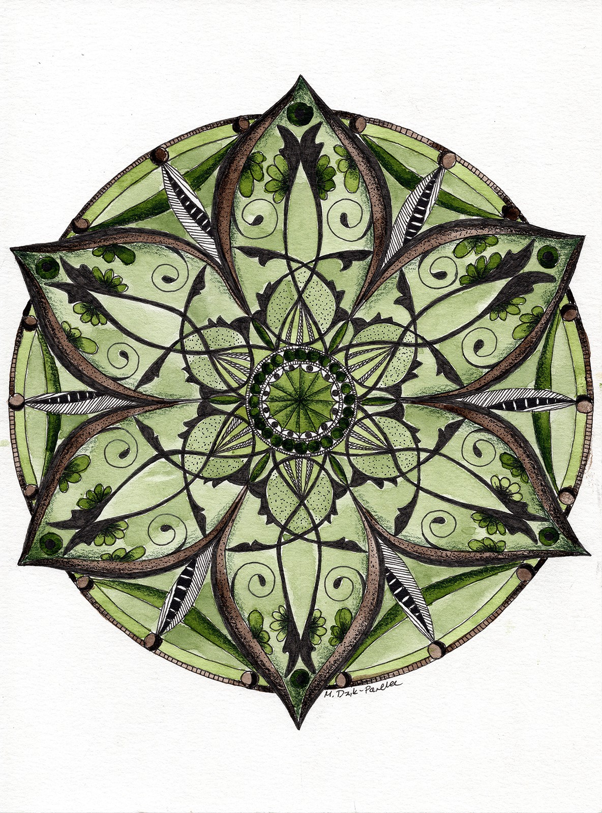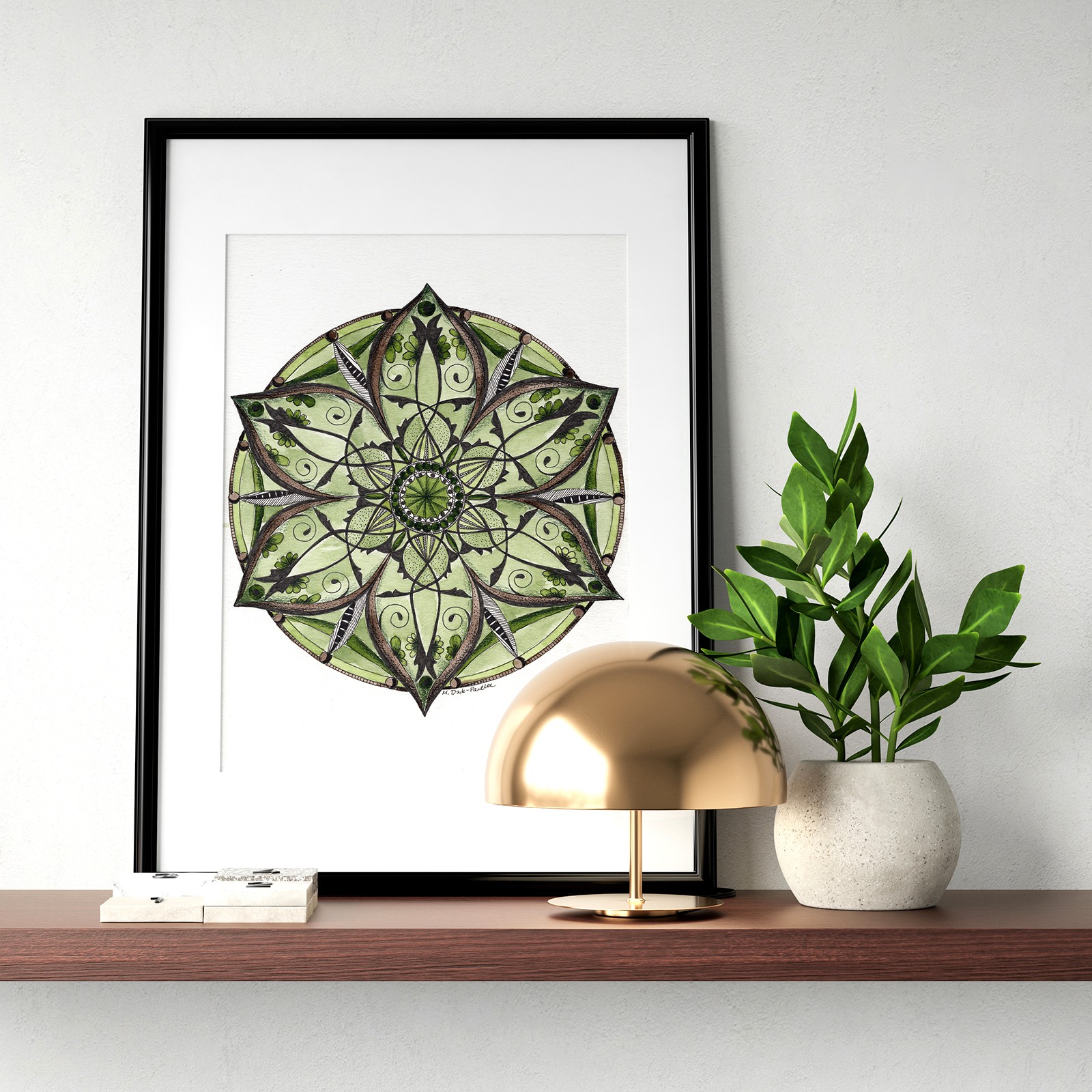 Akwarela - Elfia Mandala skąpana w kolorach natury- zieleni.